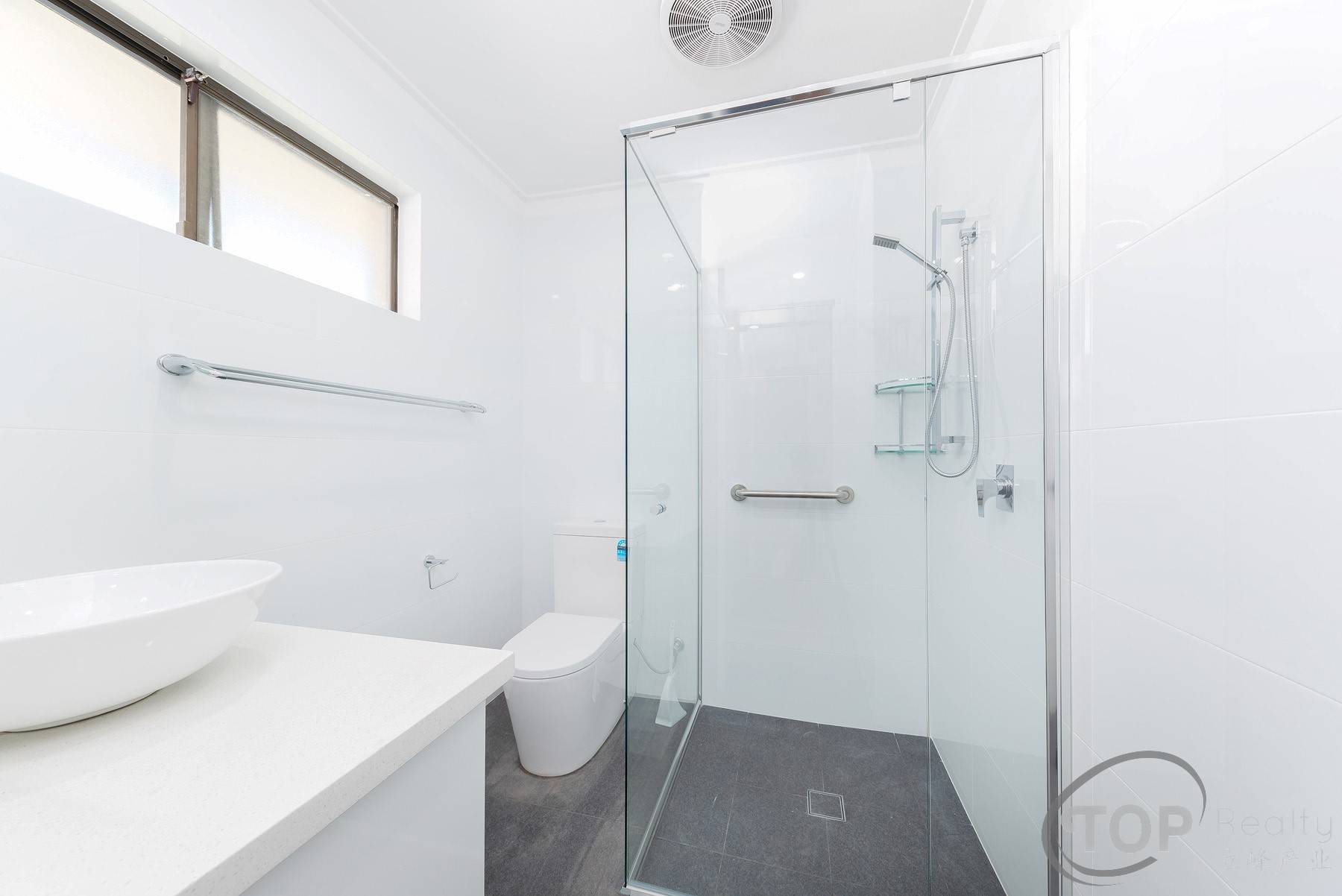 Newly renovated large common bathroom with bath & shower; features full height wall tiling, stone bench top, above bench sink & hobless shower