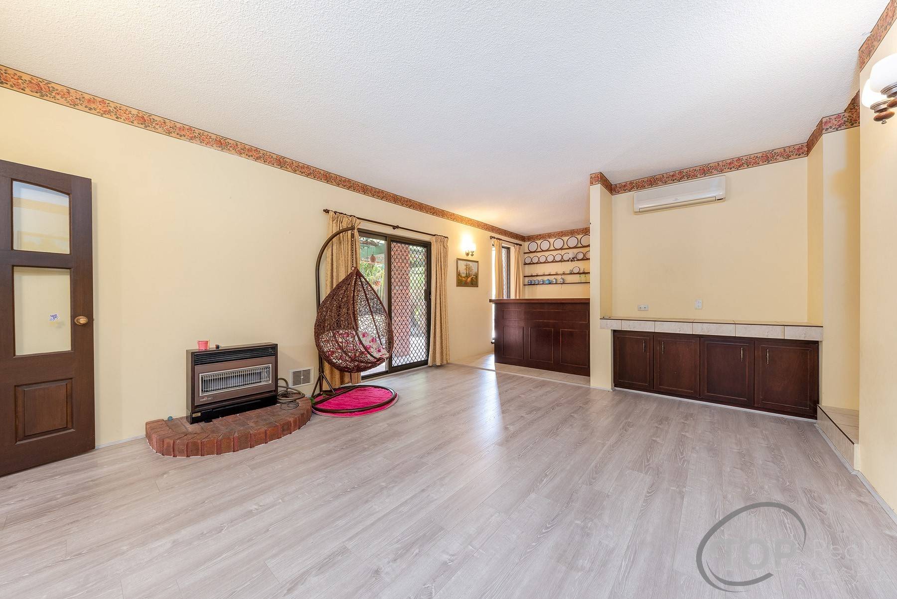 Ducted refrigerated air-con system, one split air-con unit to family room & one wall air con unit to main bedroom (cooling only)