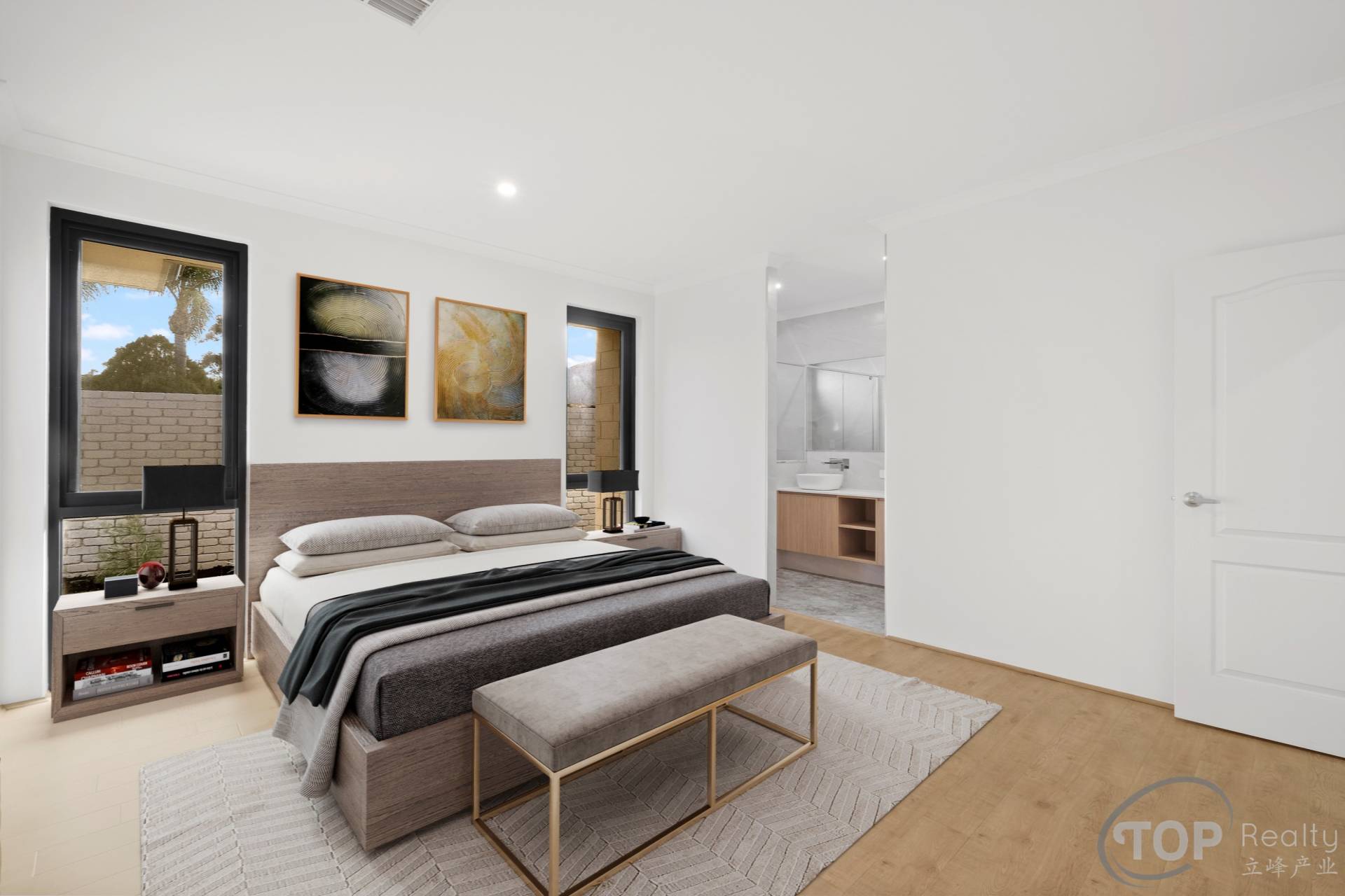 Large master bedroom comes with en-suite featuring double vanity stone bench top & large walk-in wardrobe