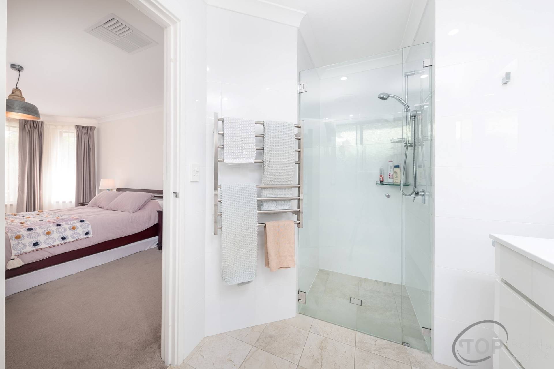 Large main bedroom with walk-in robe & renovated ensuite features full height wall tiling, hobless & frameless shower