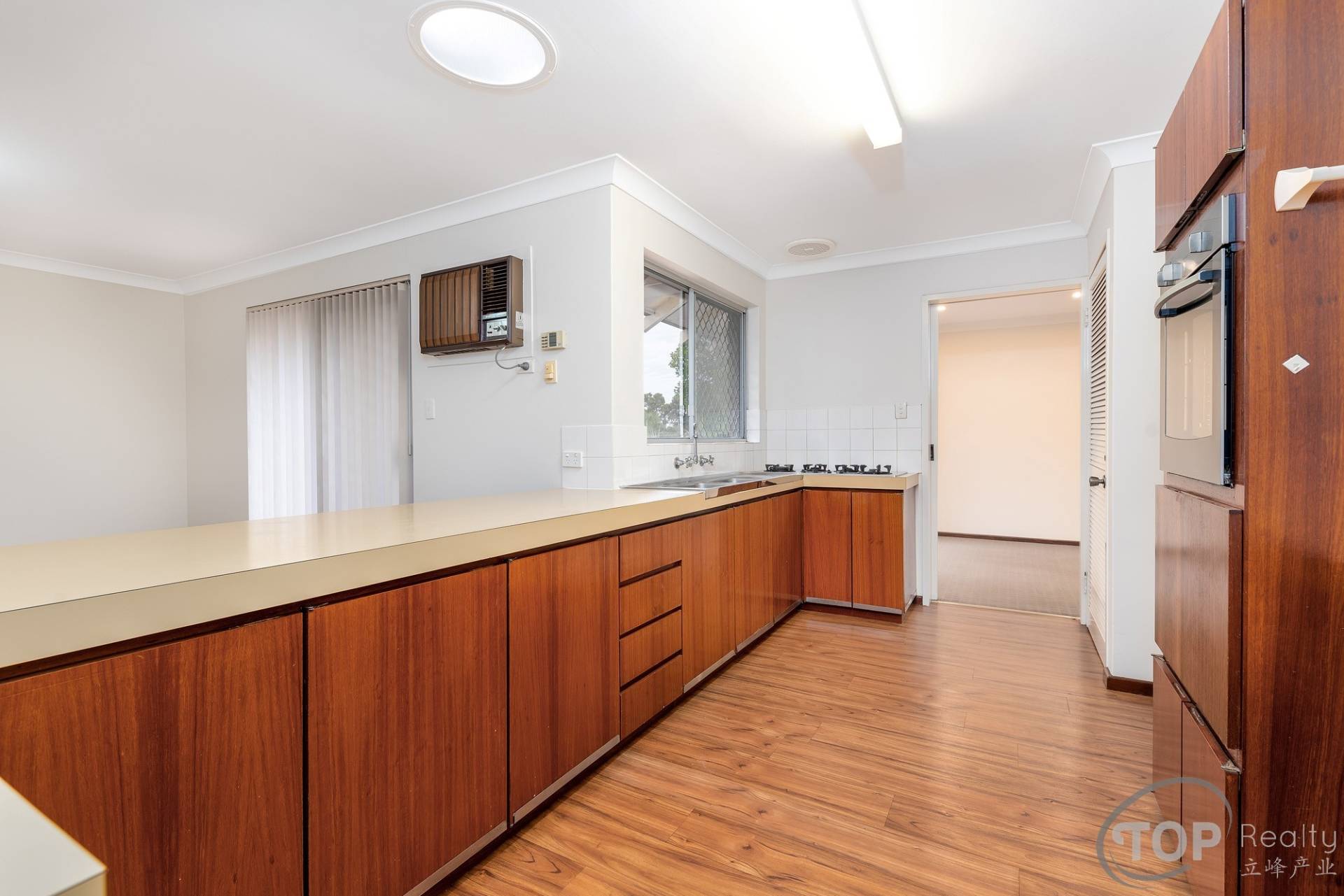Kitchen with gas cook top, lots of storage cabinets & bench top space