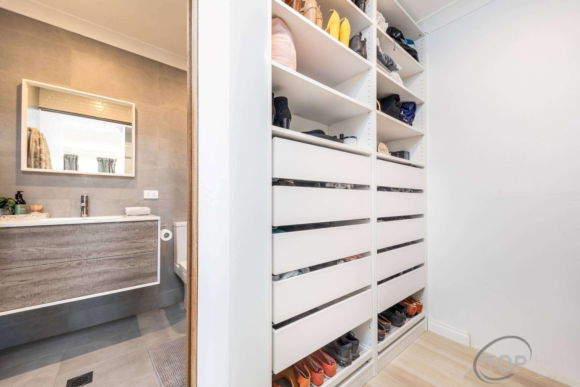 Main bedroom features built-in wardrobe with shelving; beautifully renovated ensuite features full height wall tiling, hobless shower & wall hung vanity cabinet