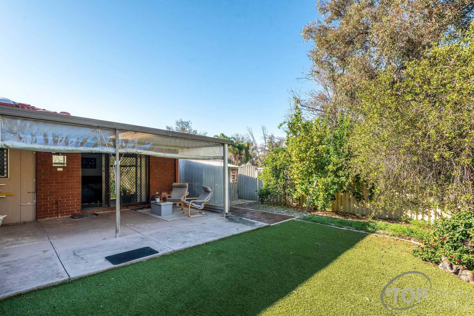 Low maintenance backyard with patio & roll down blinds, & artificial lawns