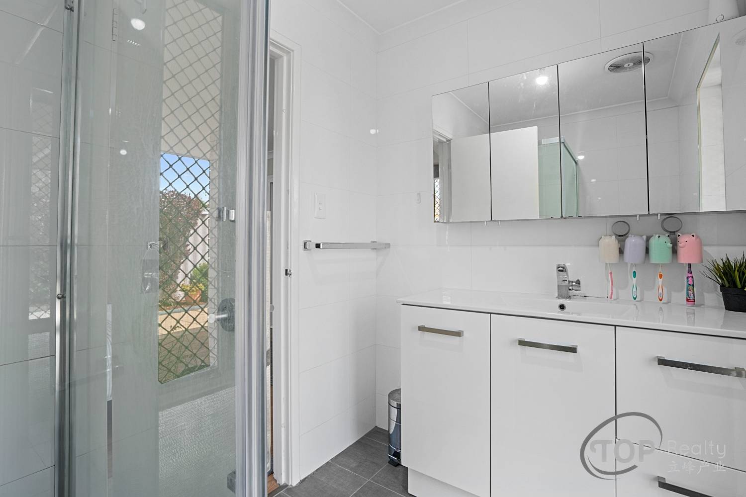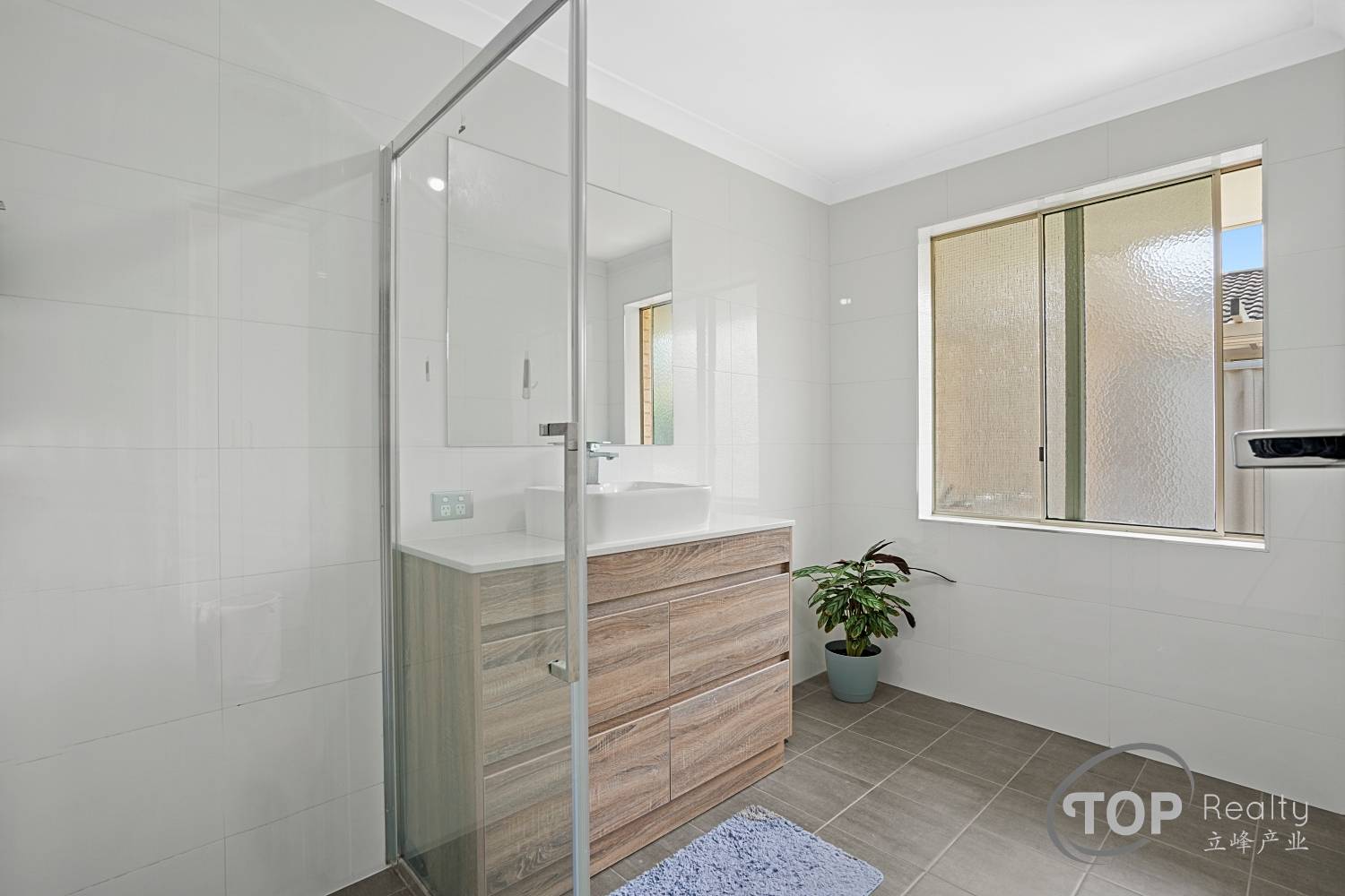 Renovated common bathroom with stone benchtop & floor to ceiling tiling