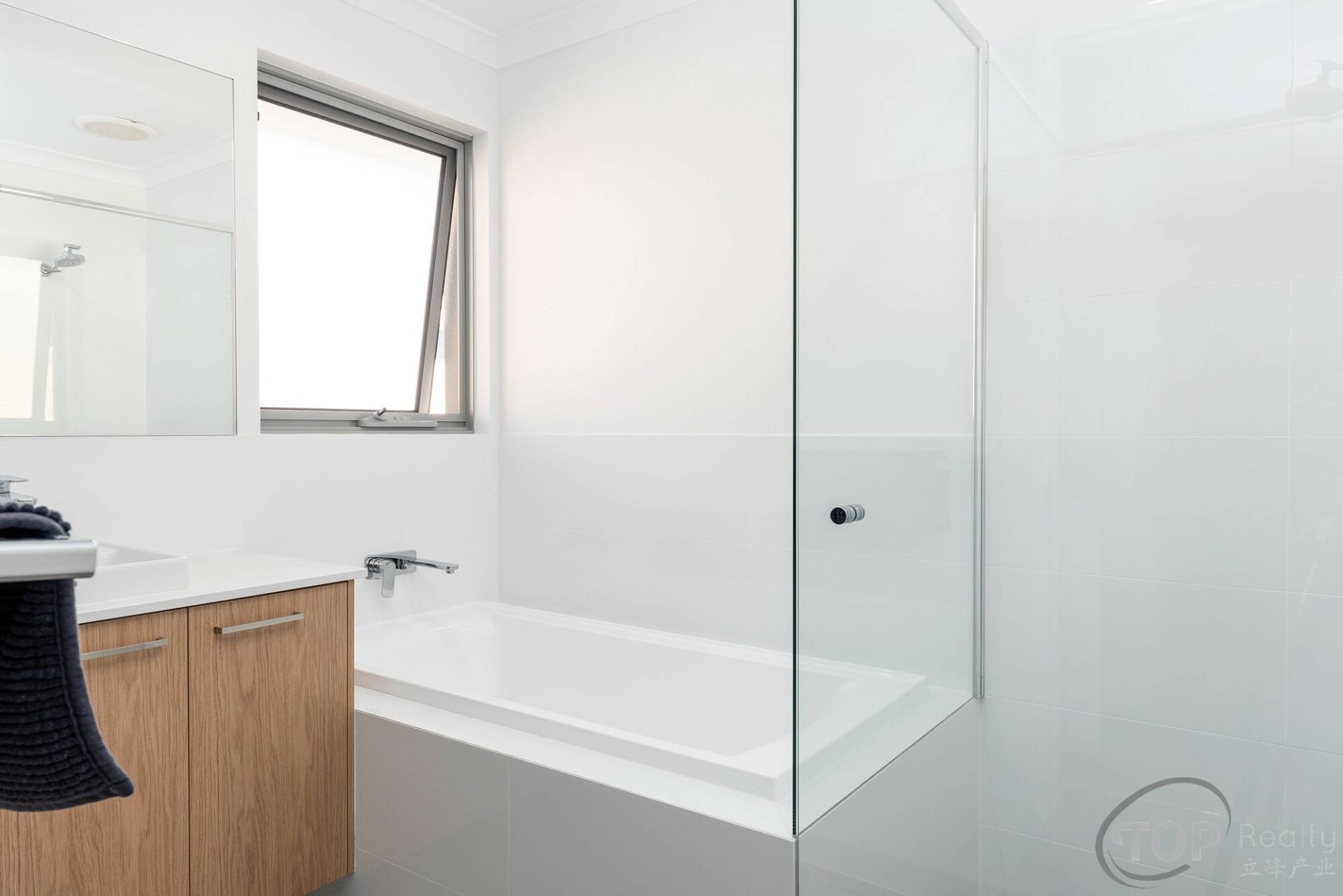 Common bathroom with hobless shower & bath