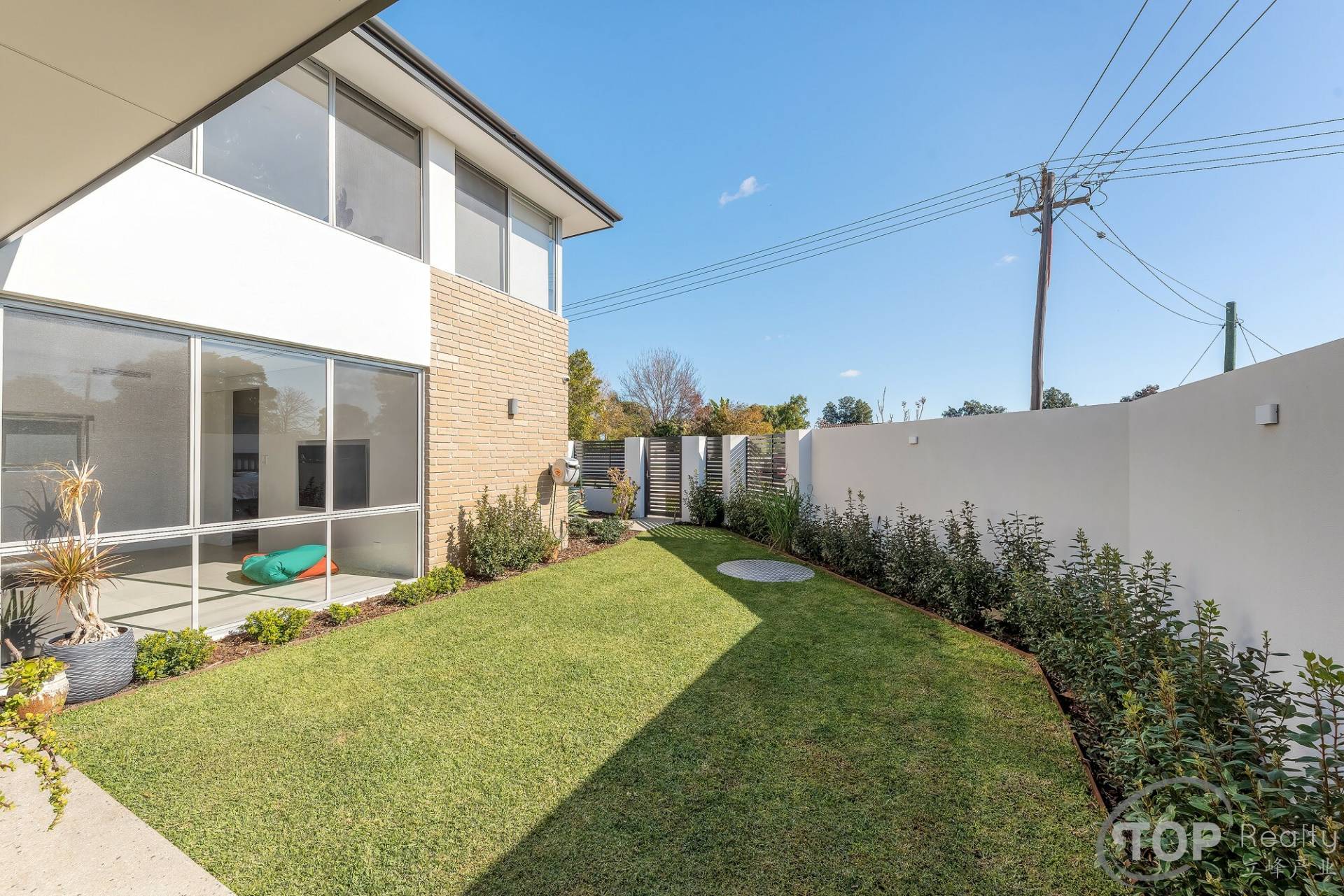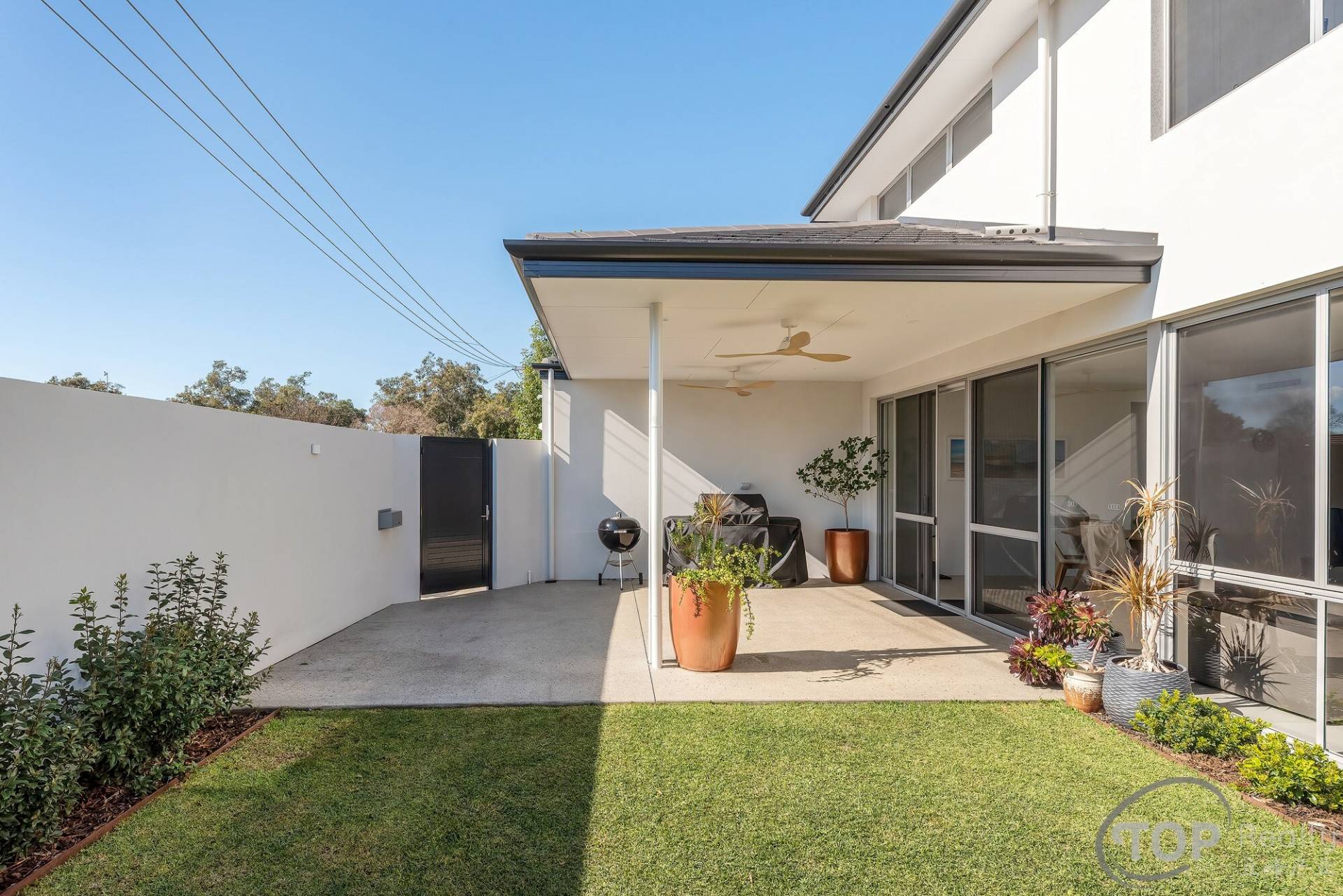 The low maintenance landscaped outdoor area features an alfresco with exposed aggregate concrete flooring and ample space for your kids to play.