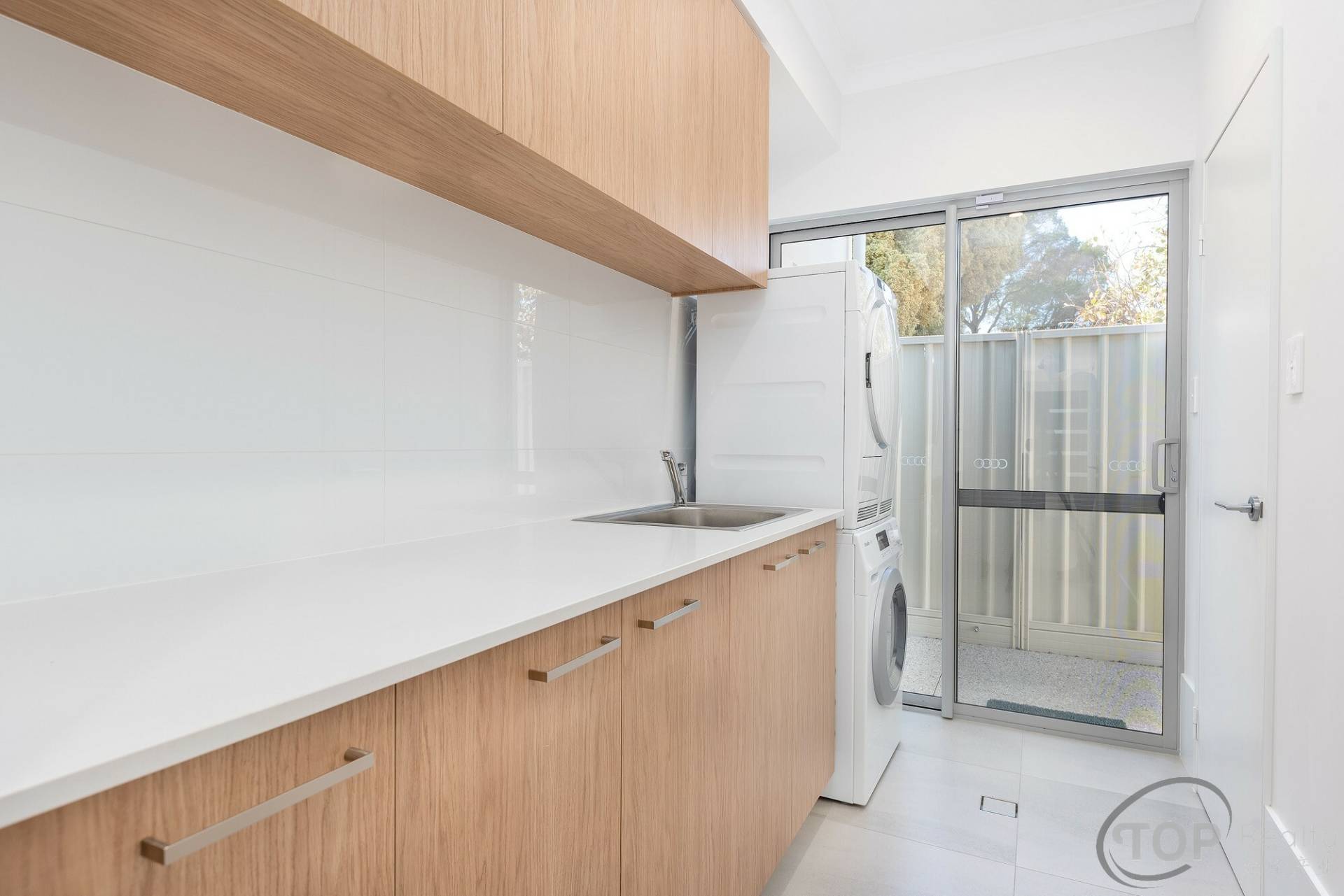 Laundry with stone bench top & plenty of storage cabinets