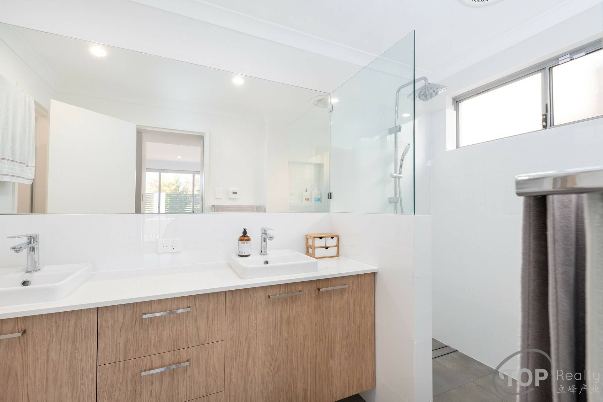 Large master bedroom downstairs with His & Hers walk-in wardrobe & ensuite well appointed with stone bench top, double vanity & rainshower