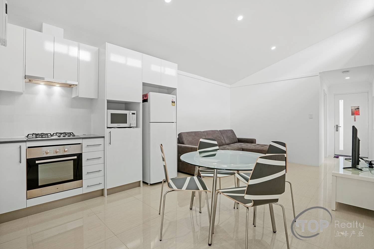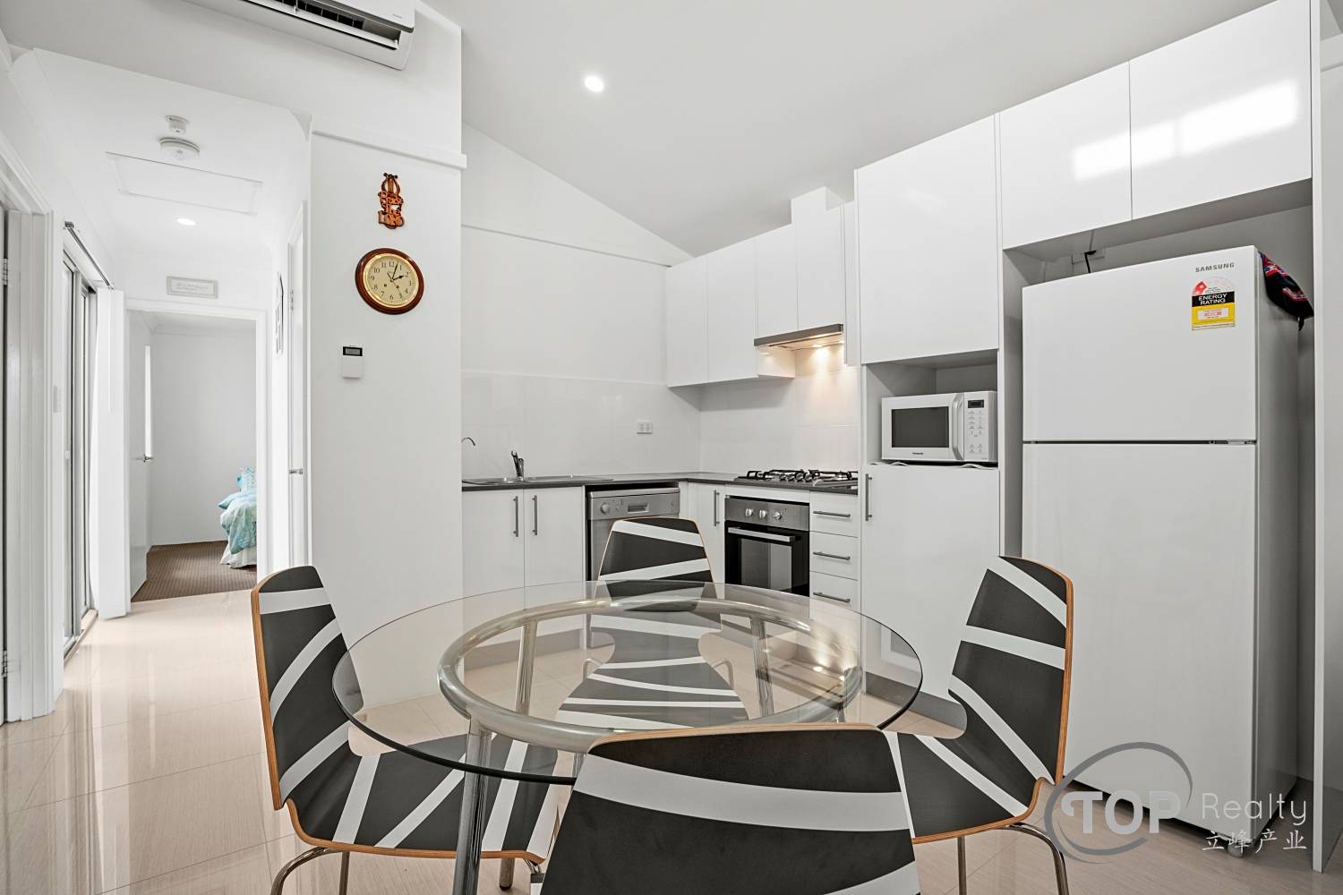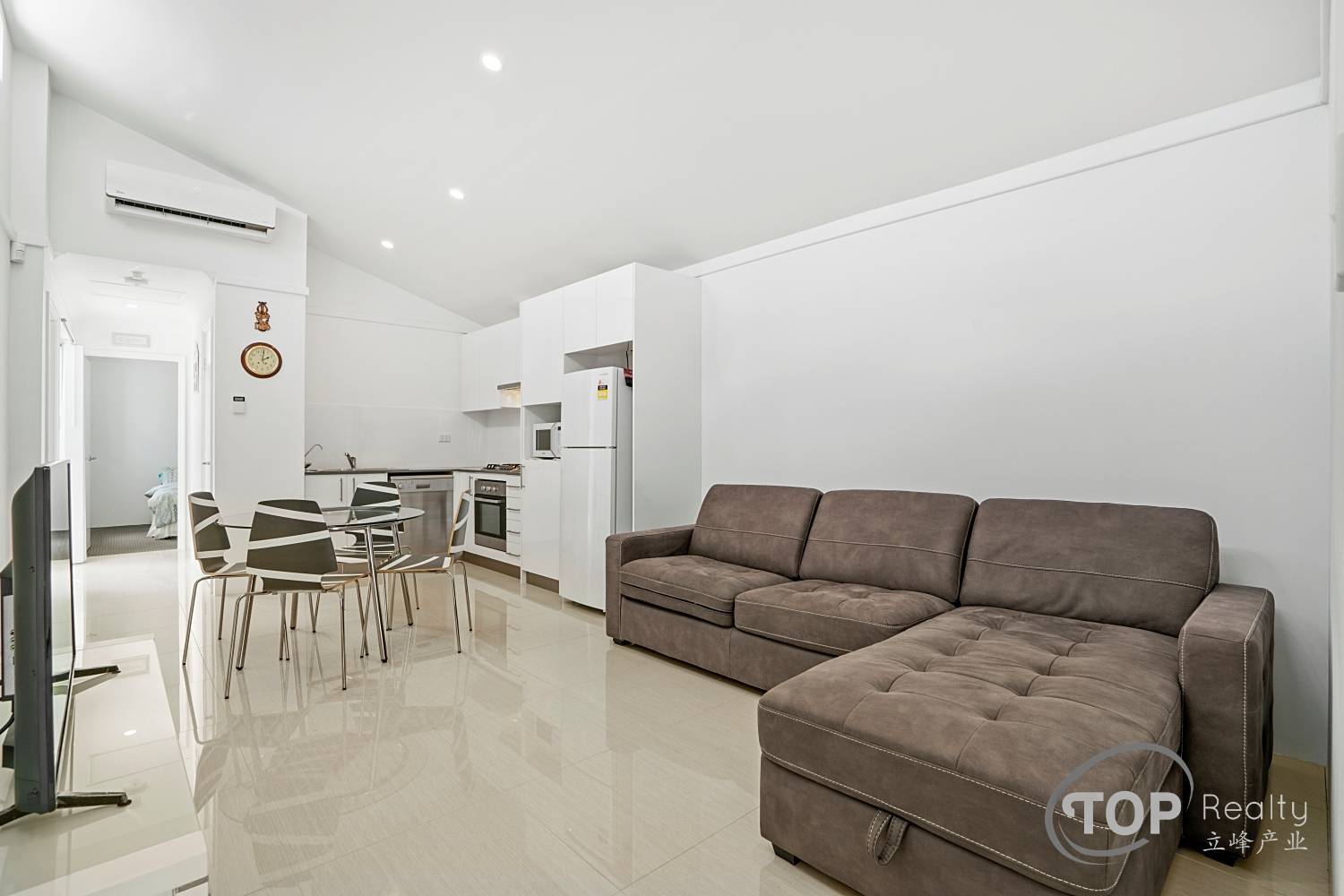 Open plan kitchen, meals & living area with high ceilings and split r/c a/c