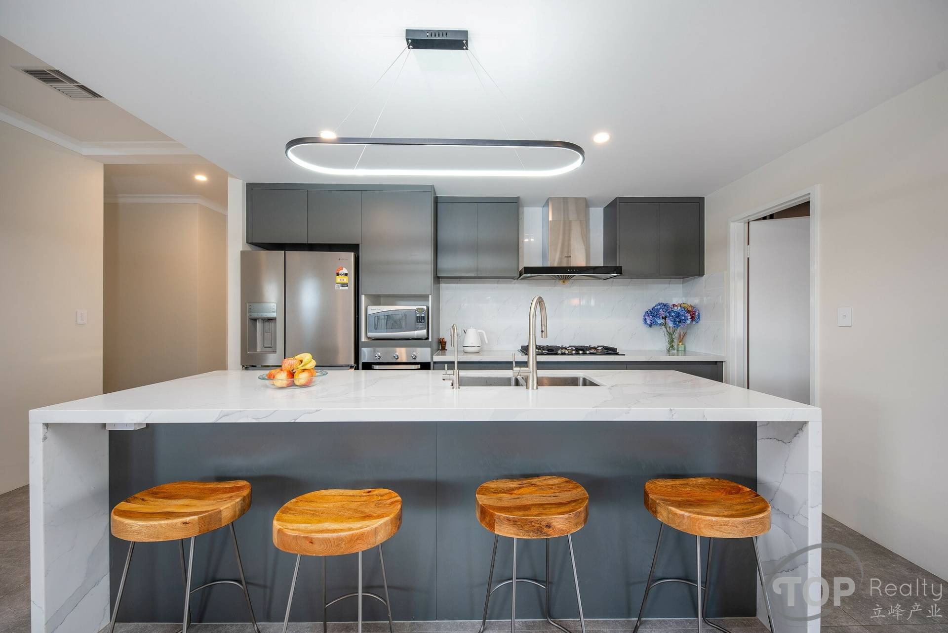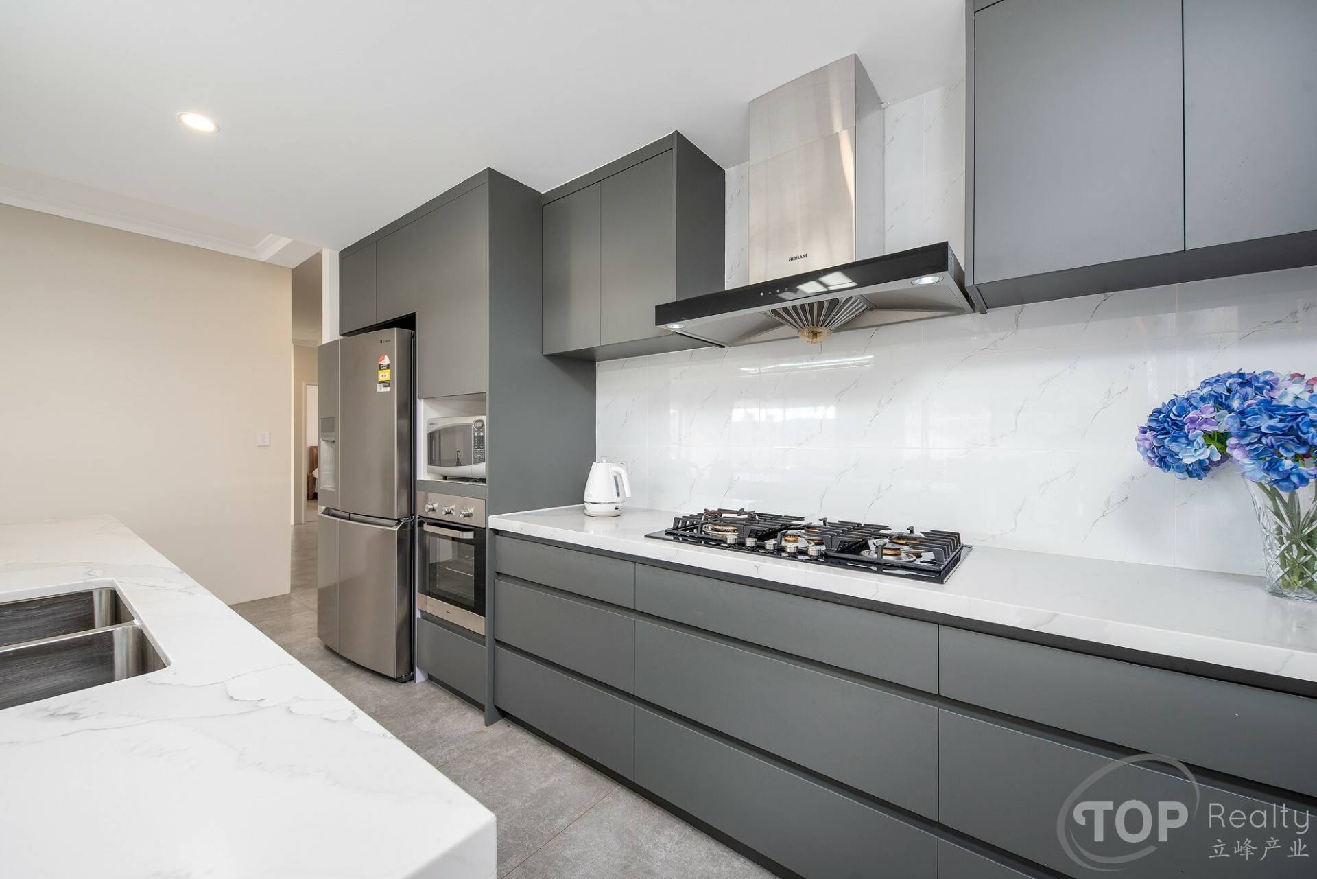 Modern designer kitchen with breakfast island, stone bench top, gas cook top & abundant cabinet storage space