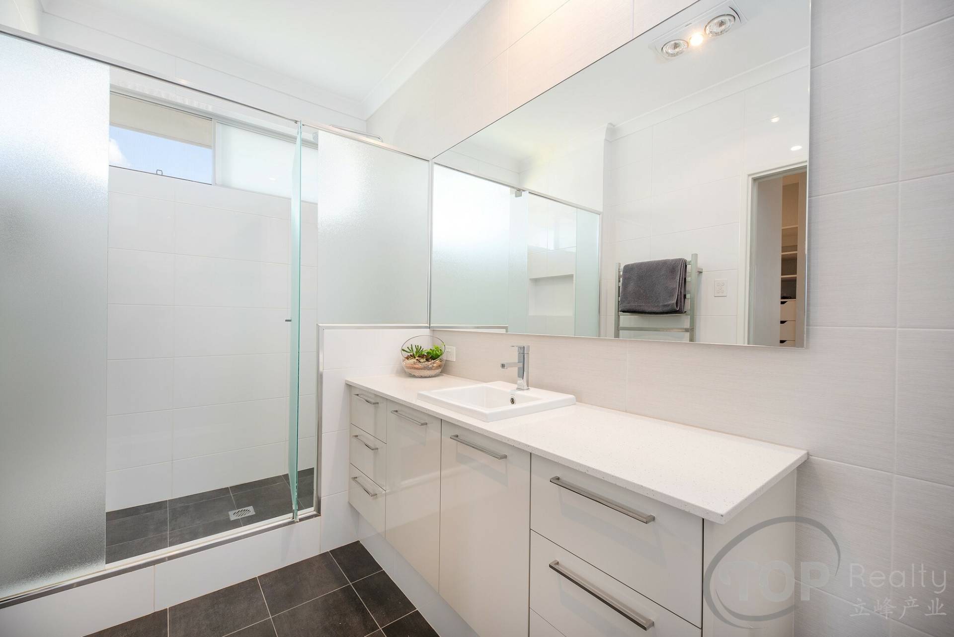 Sprawling master bedroom upstairs with parent’s retreat area, fitted walk in wardrobe & luxurious ensuite featuring stone bench vanity top, full height wall tiling & rainshower