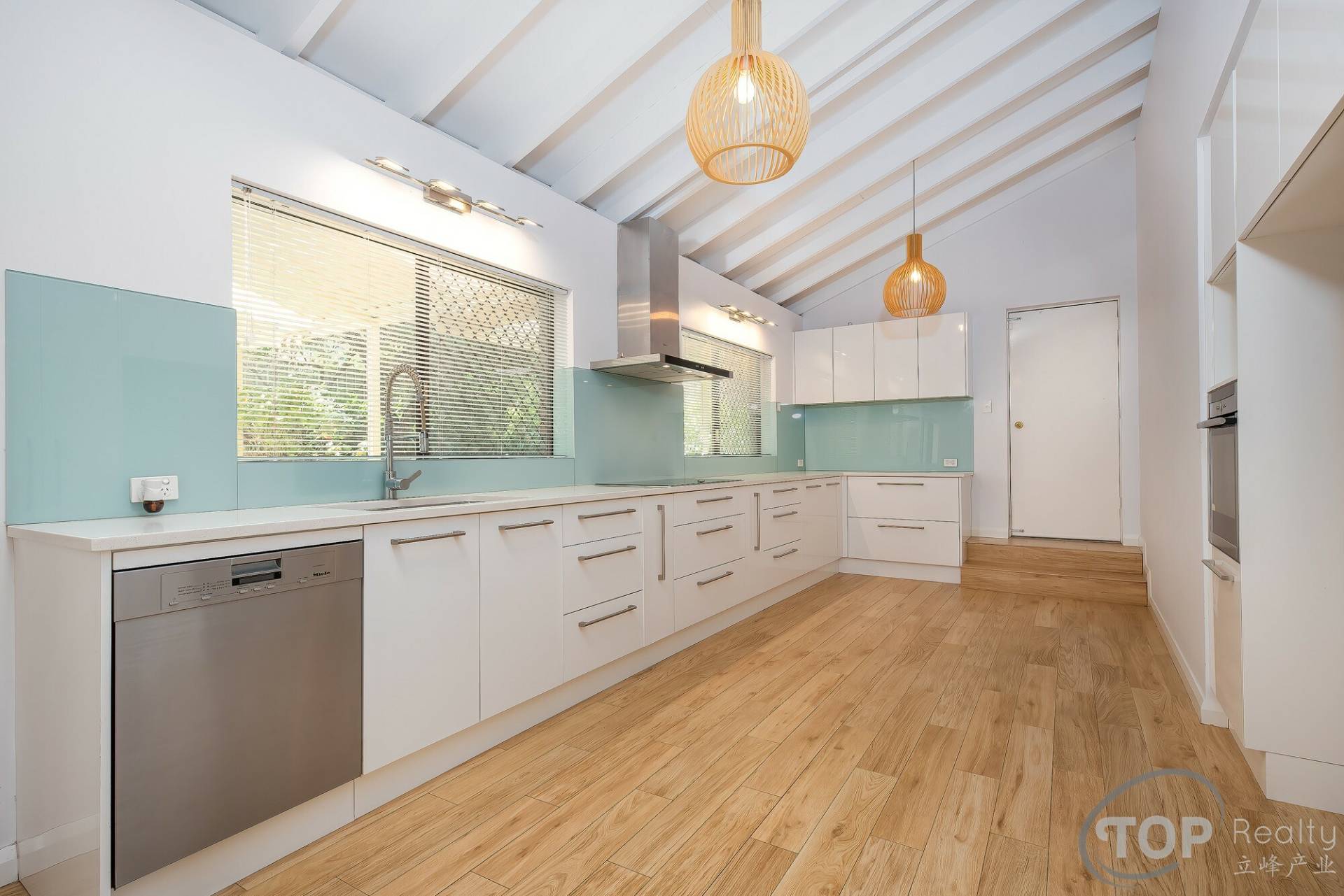 Extra large beautifully renovated kitchen featuring raked ceiling, stone bench top, NEFF appliances, Miele dishwasher & loads of storage cabinets