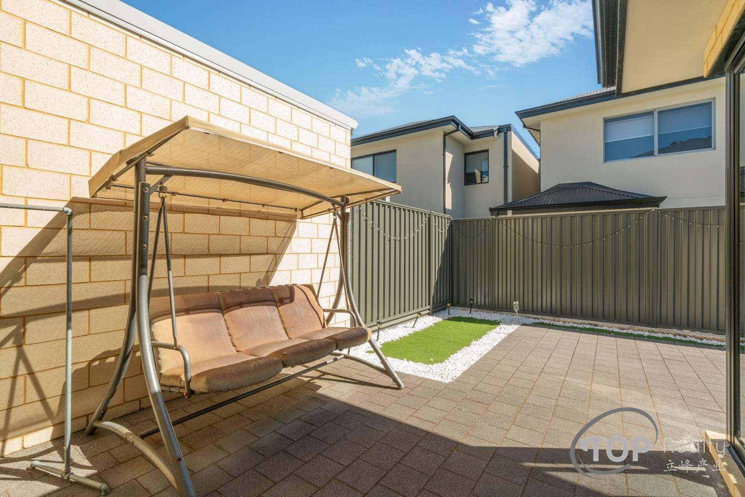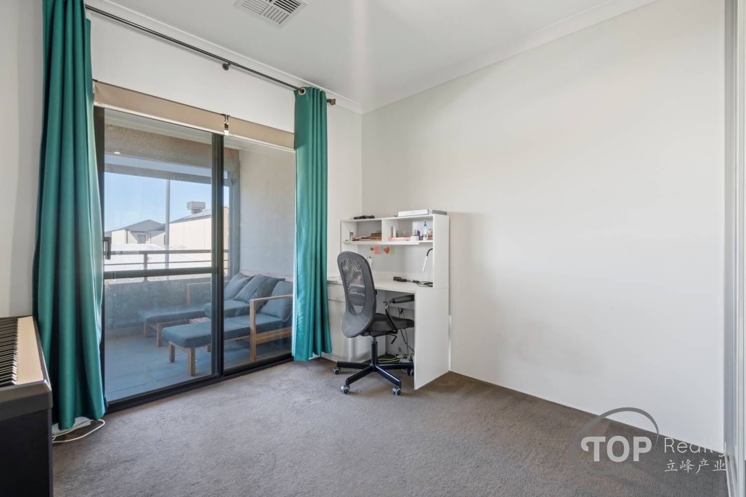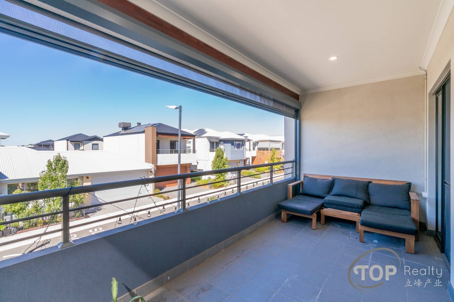 Front balcony features outdoor blinds