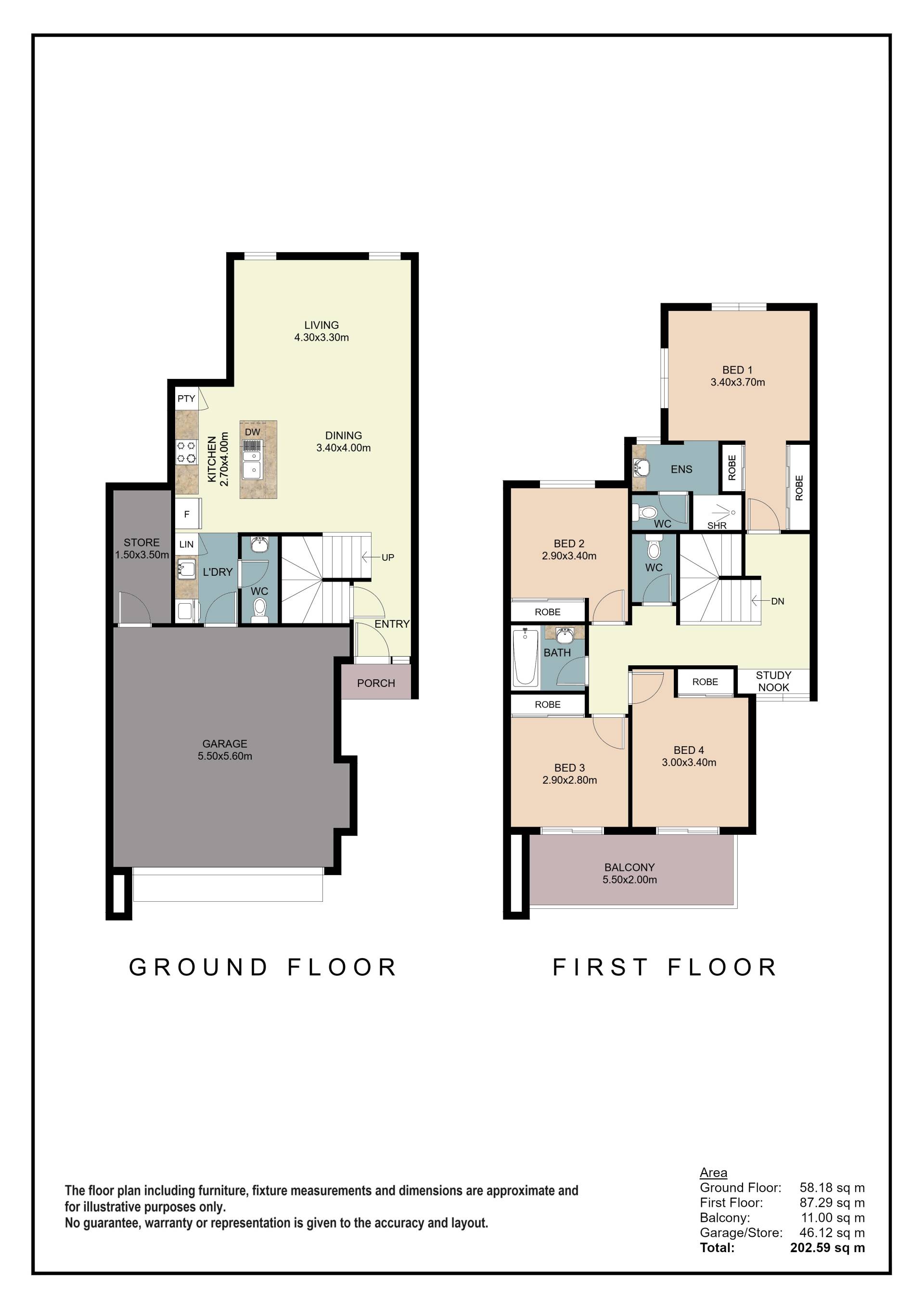 The ground floor features a spacious open plan living, dining and kitchen area. The kitchen is well appointed with gas cook top, range hood and breakfast island bench. The bedrooms are spacious and feature generous wardrobe space. The storage area in the garage and understairs store provide plentiful internal storage space. A study nook upstairs provides a work area at home and there are three toilets for added convenience.