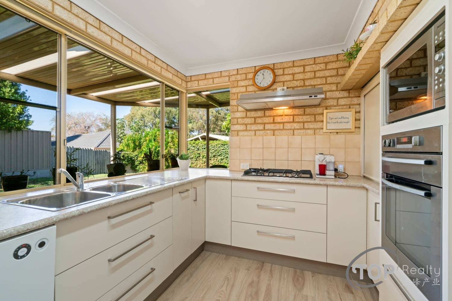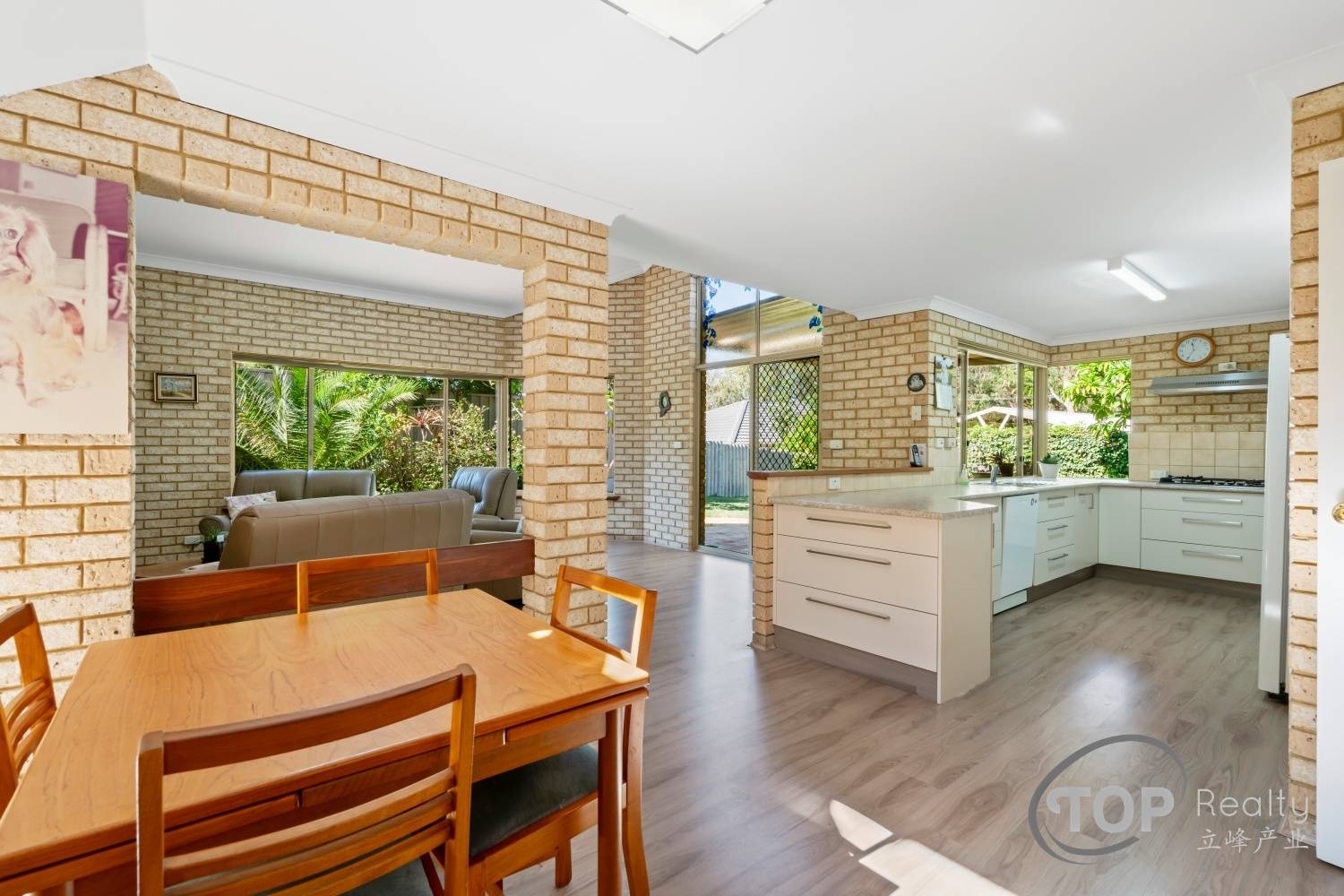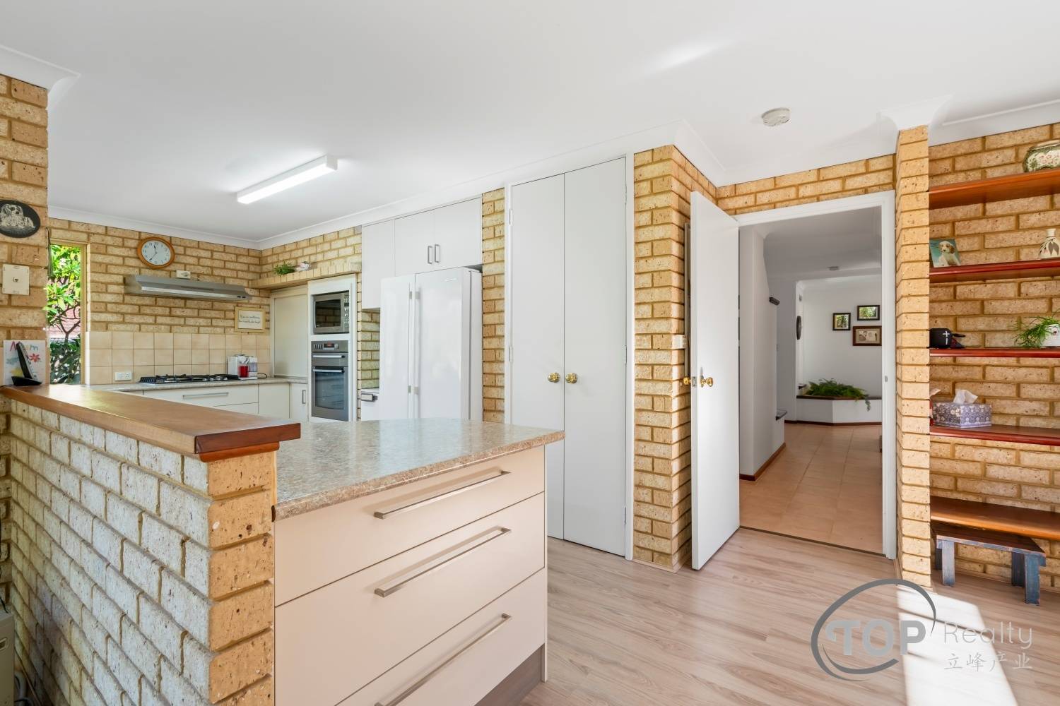 Updated kitchen features gas cook top, loads of storage cabinet & bench top space