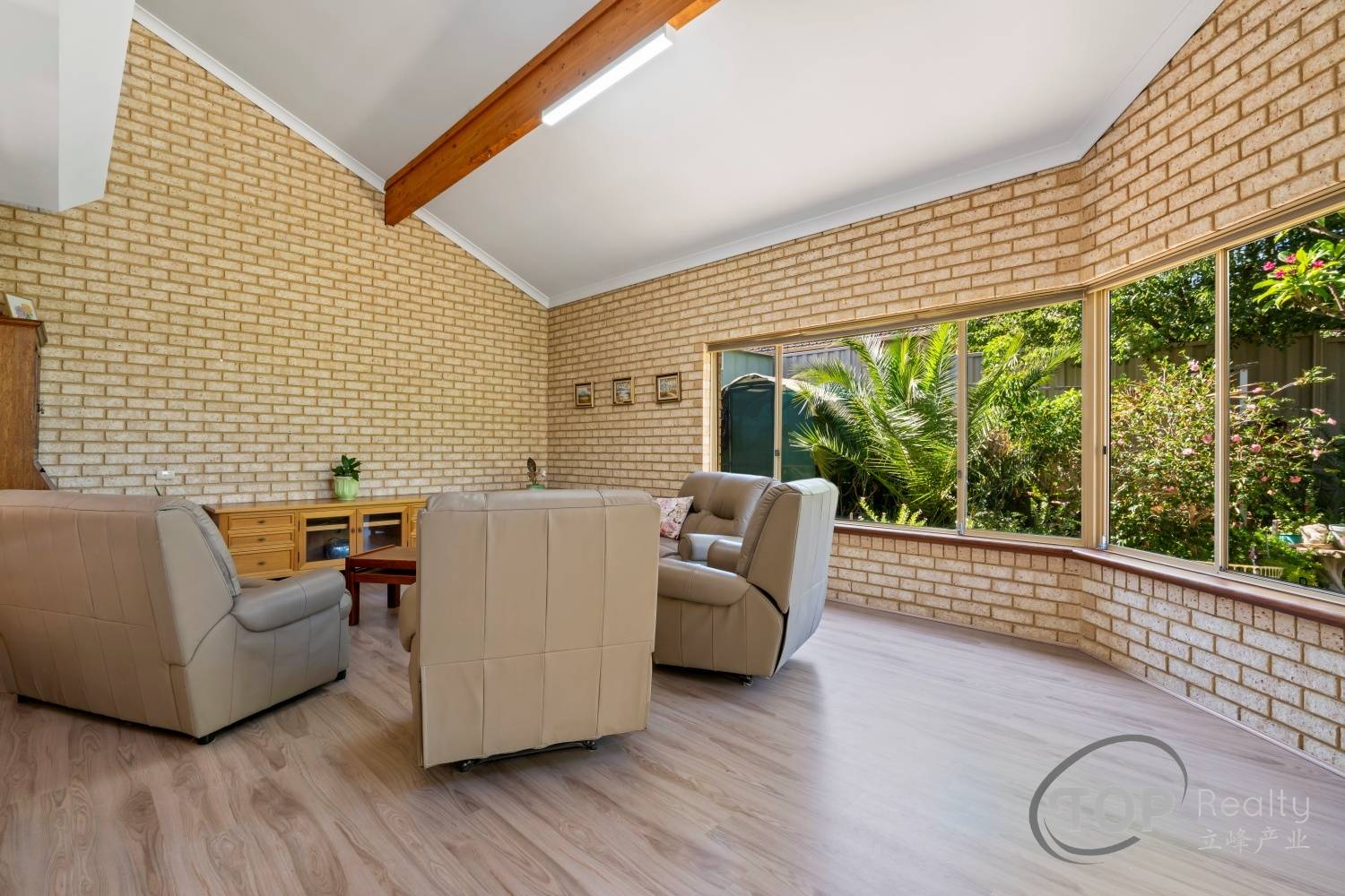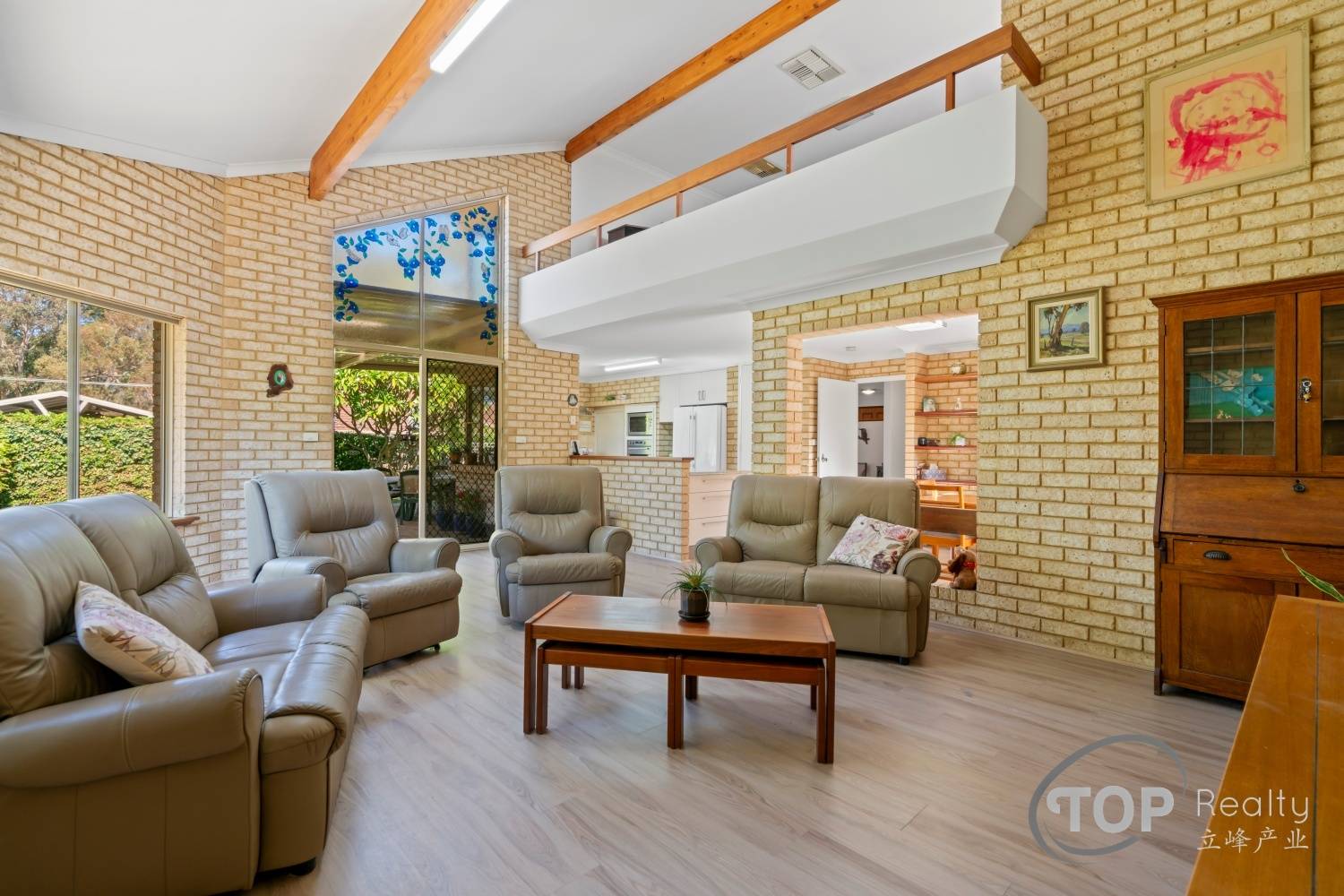 Living & games room features double height high ceiling & floating floorboards