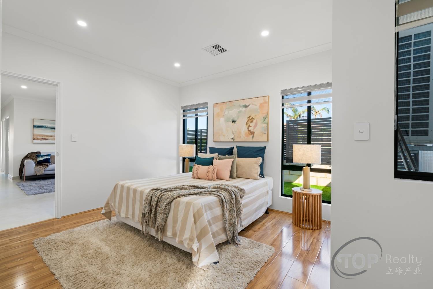 Spacious master bedroom features walk-in wardrobe; luxurious ensuite with double vanity basins & shower