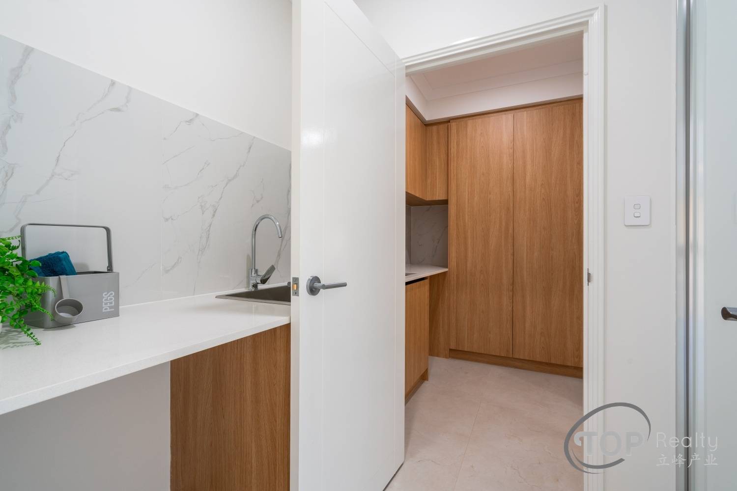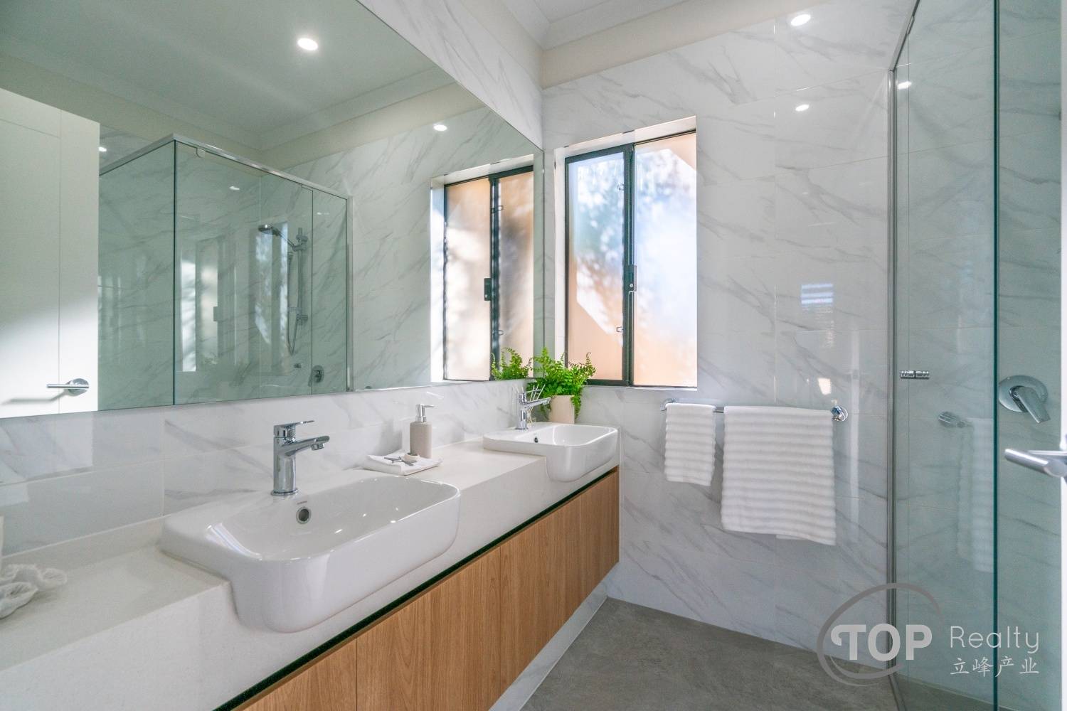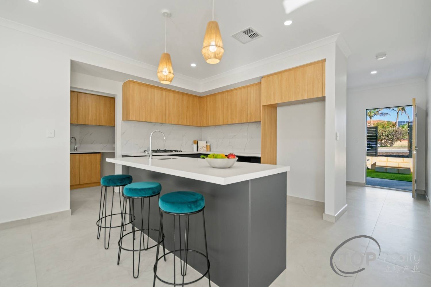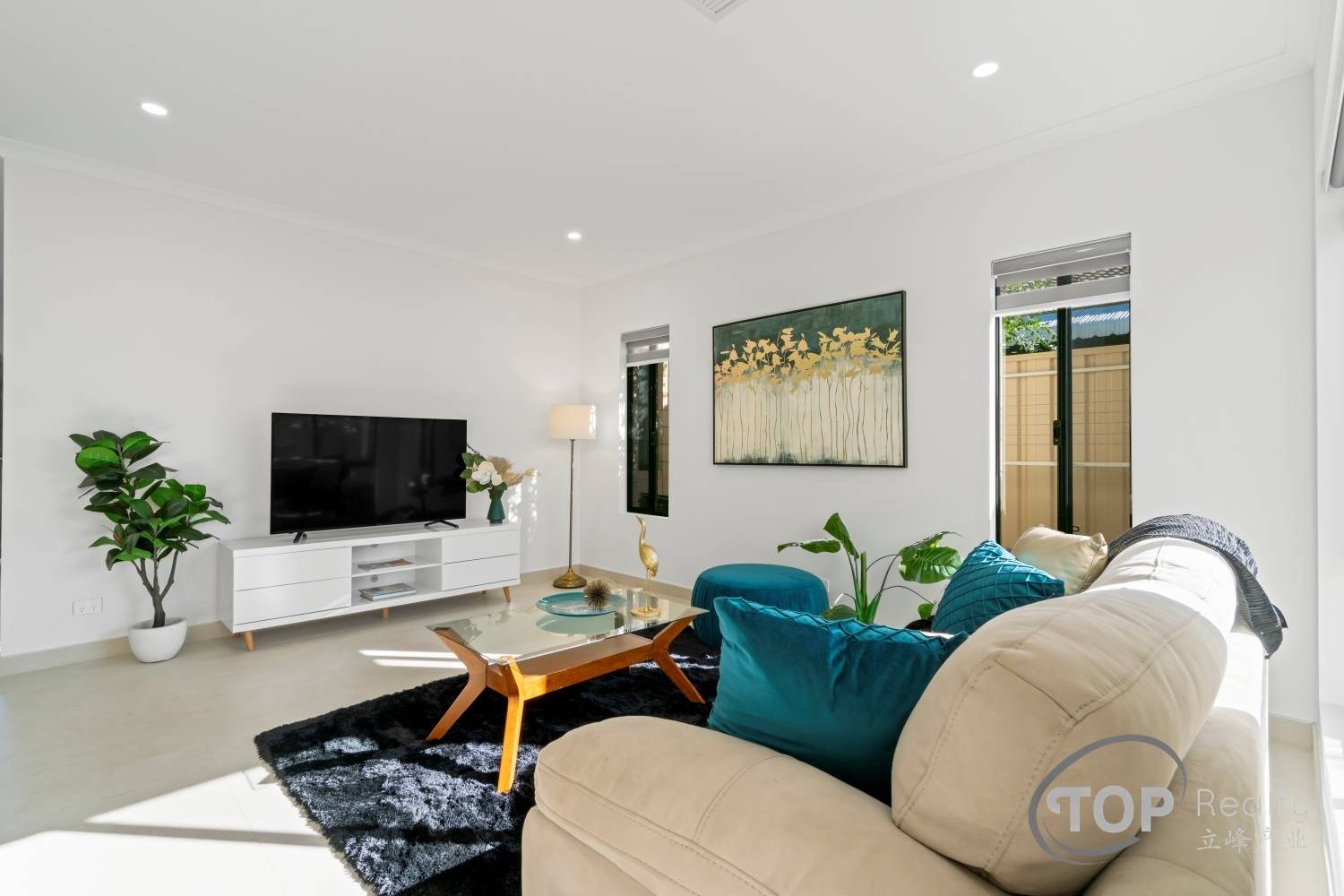 Stylish porcelain tiles adorn the living area floor. The bedrooms are well proportioned in size. The master bedroom features a luxurious ensuite with double stone top vanity. High 31 course ceilings fill the house with natural light and sense of spaciousness.