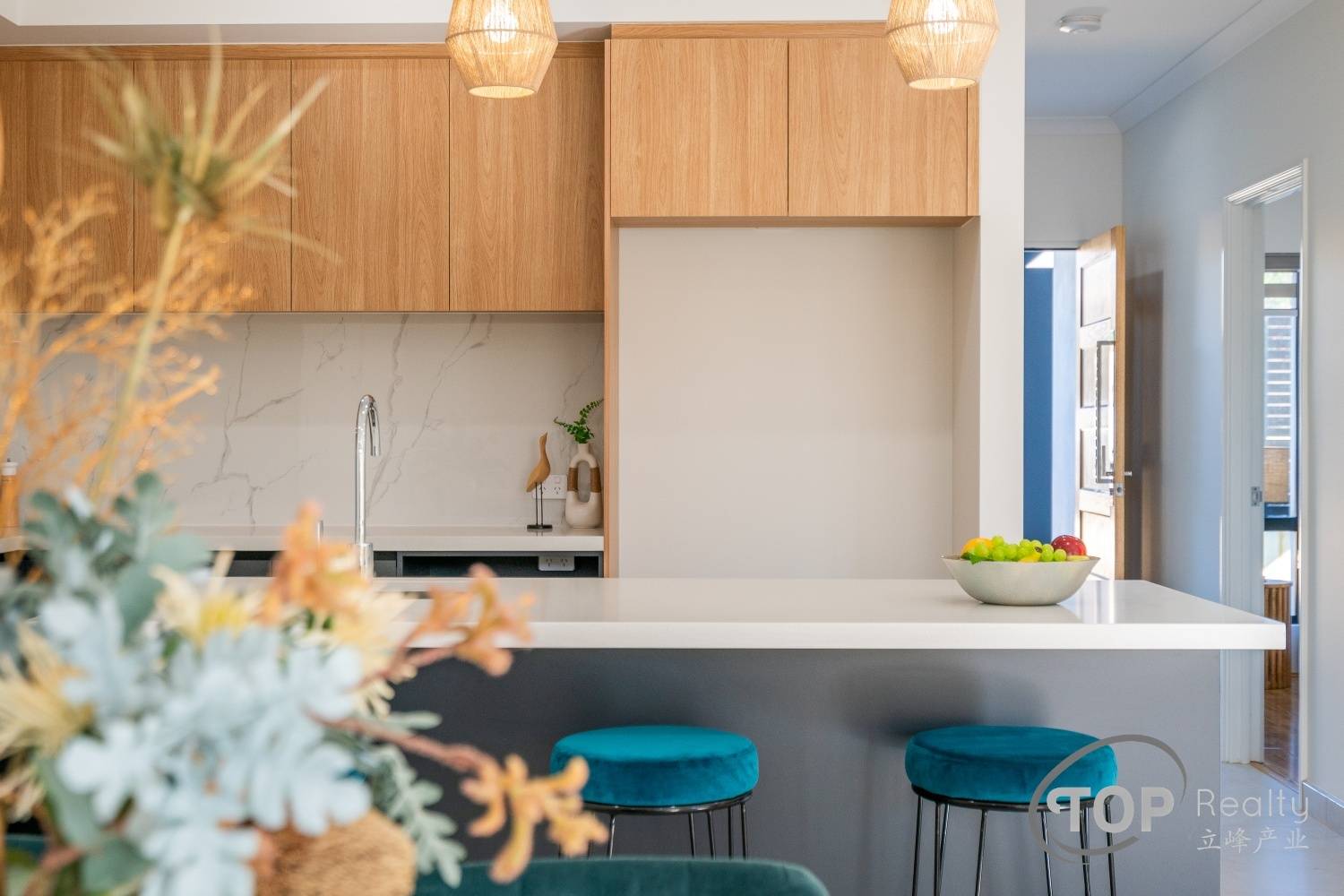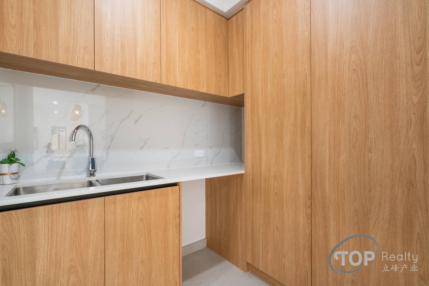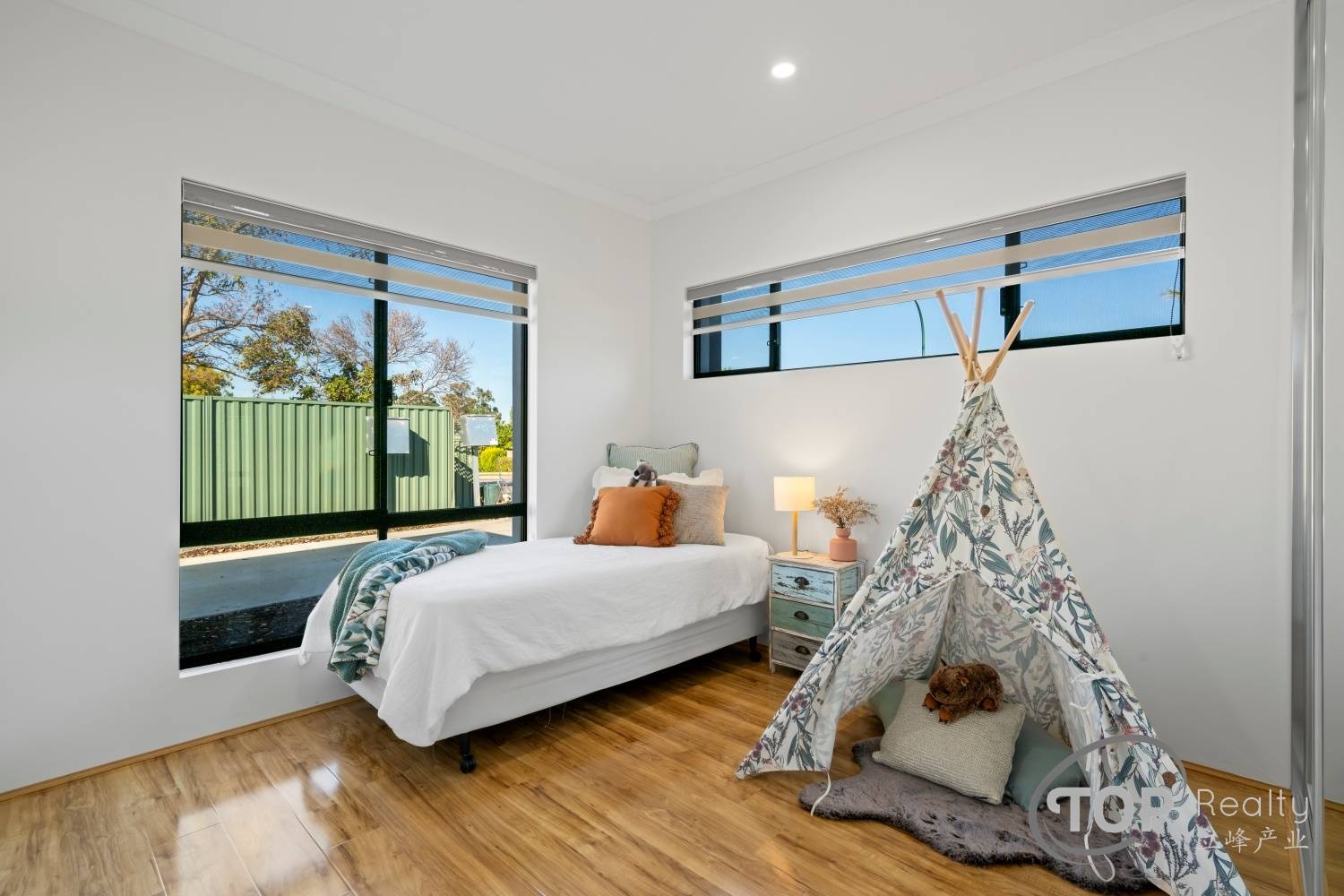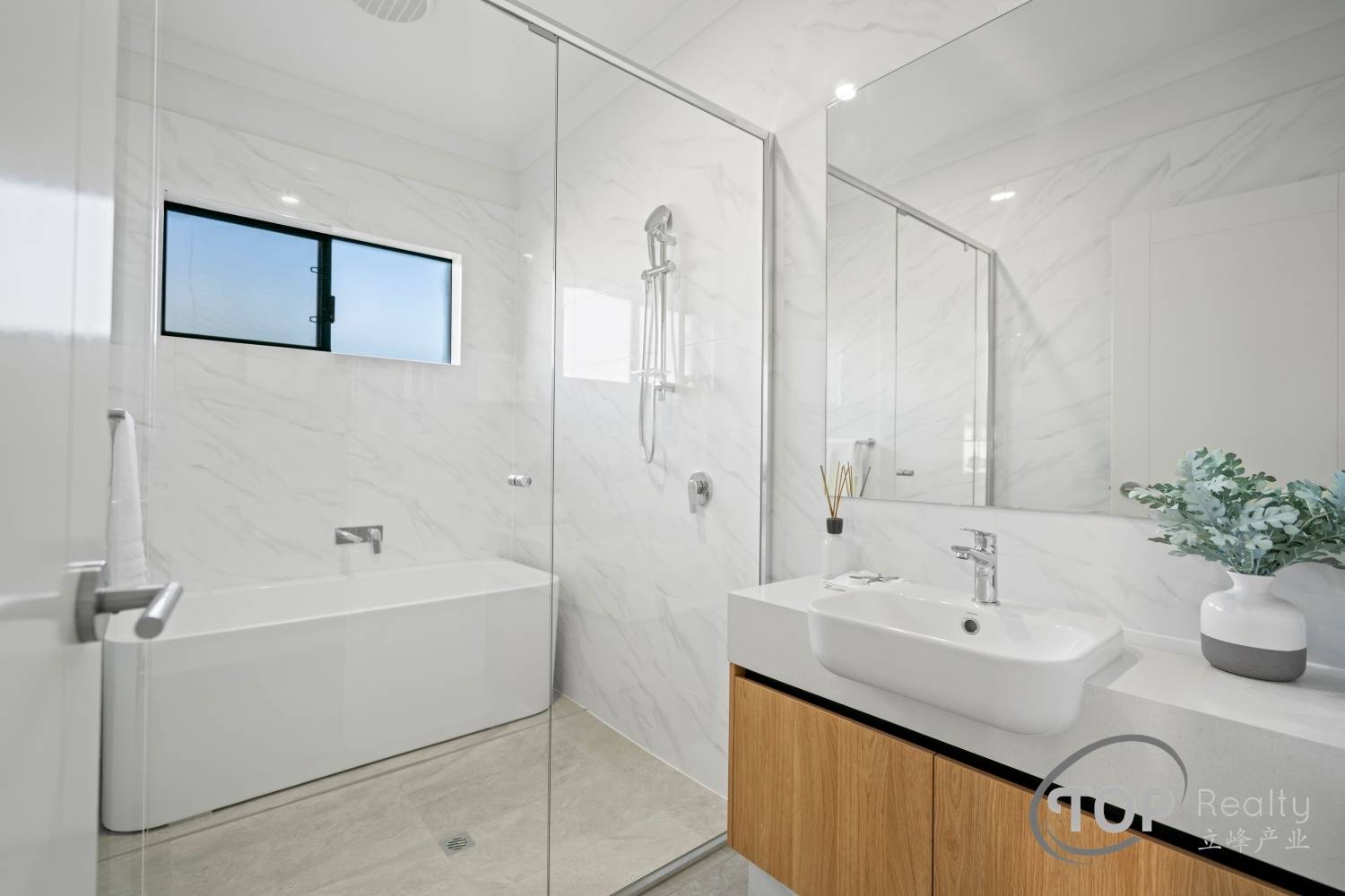 Stylish porcelain tiles adorn the living area floor. The bedrooms are well proportioned in size. The master bedroom features a luxurious ensuite with double stone top vanity. High 31 course ceilings fill the house with natural light and sense of spaciousness.