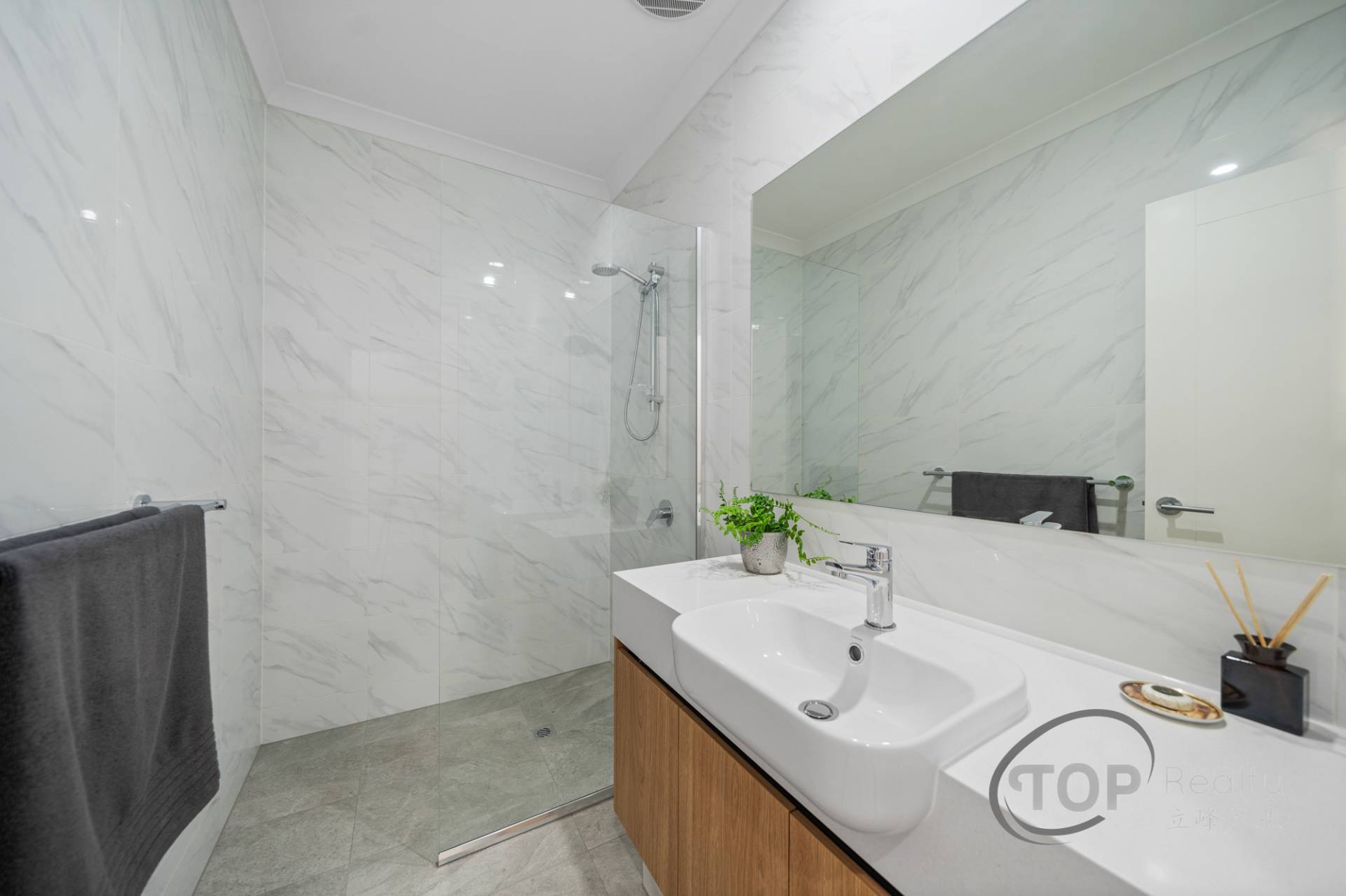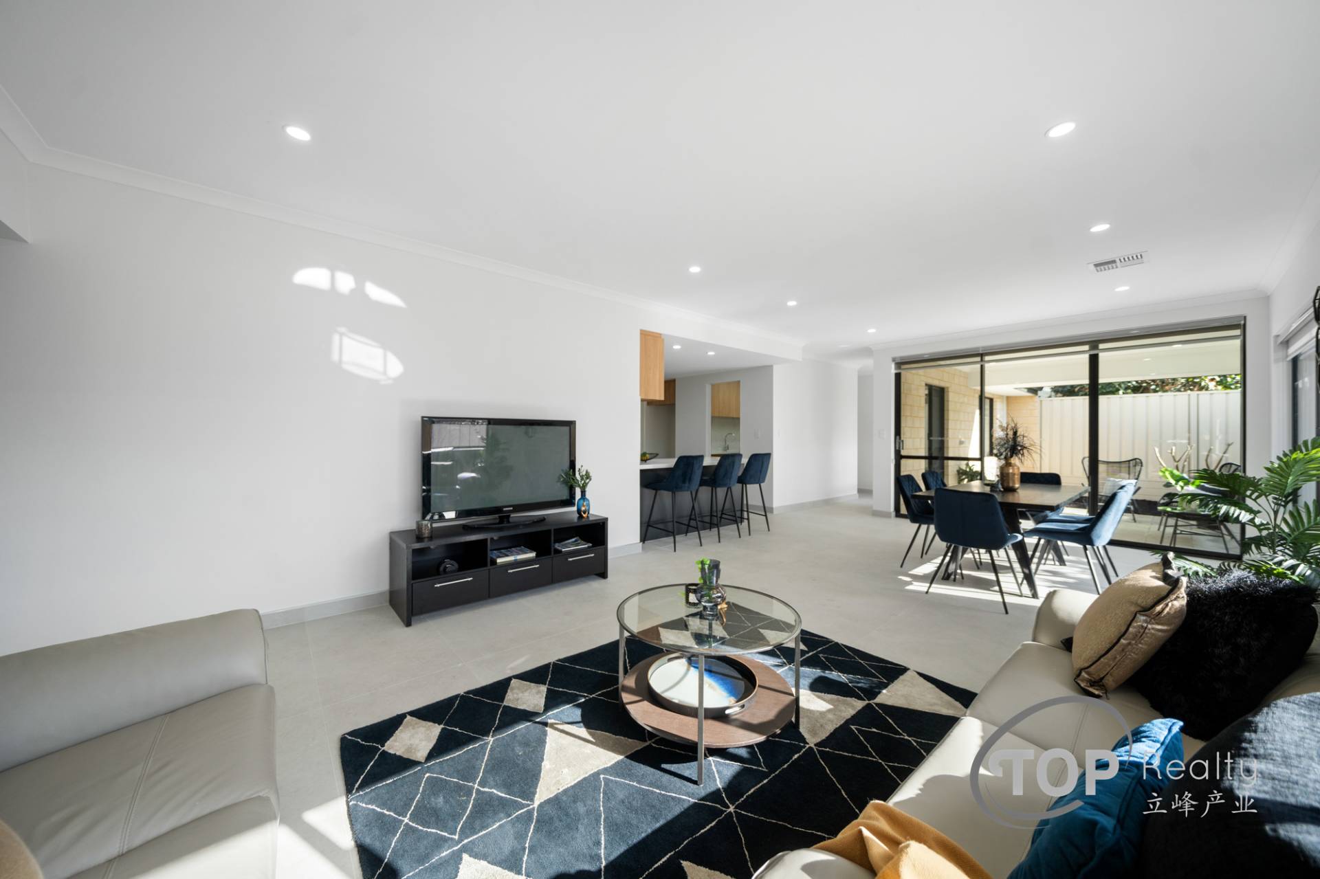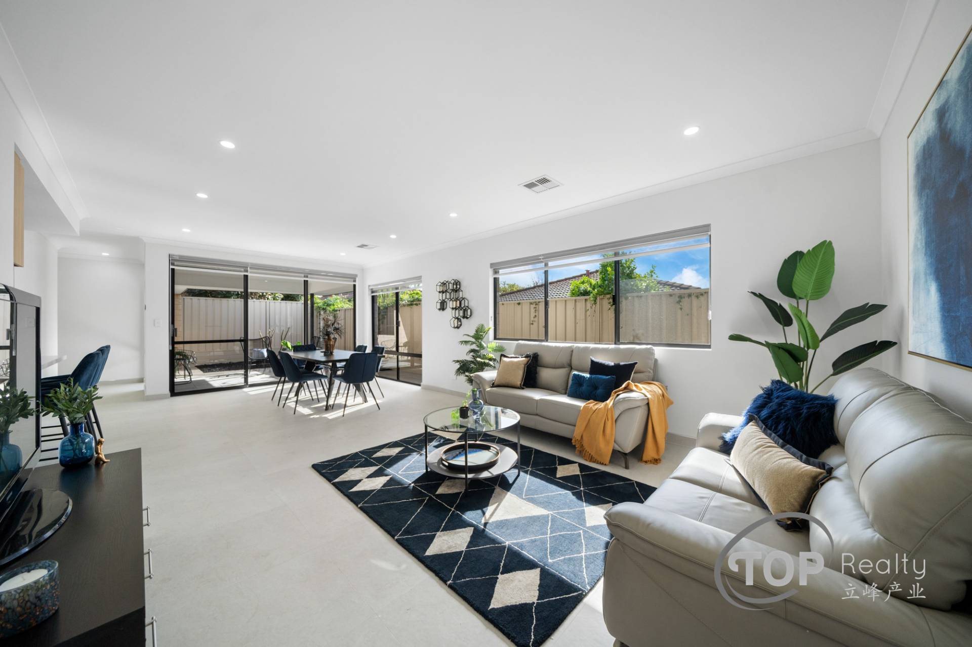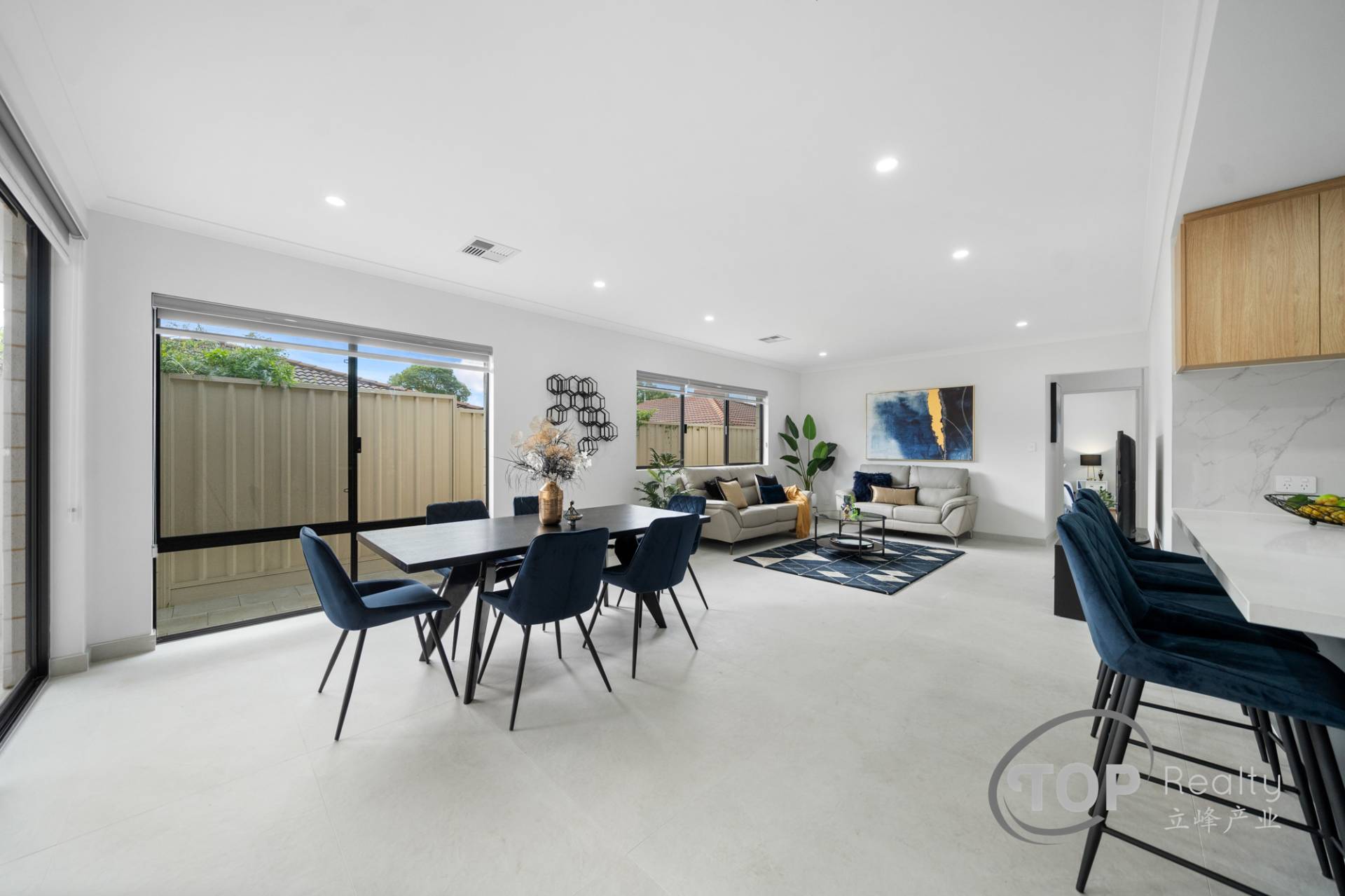 • Luxurious large format 600x1200 porcelain floor tiles in the main living areas with tiled skirting.