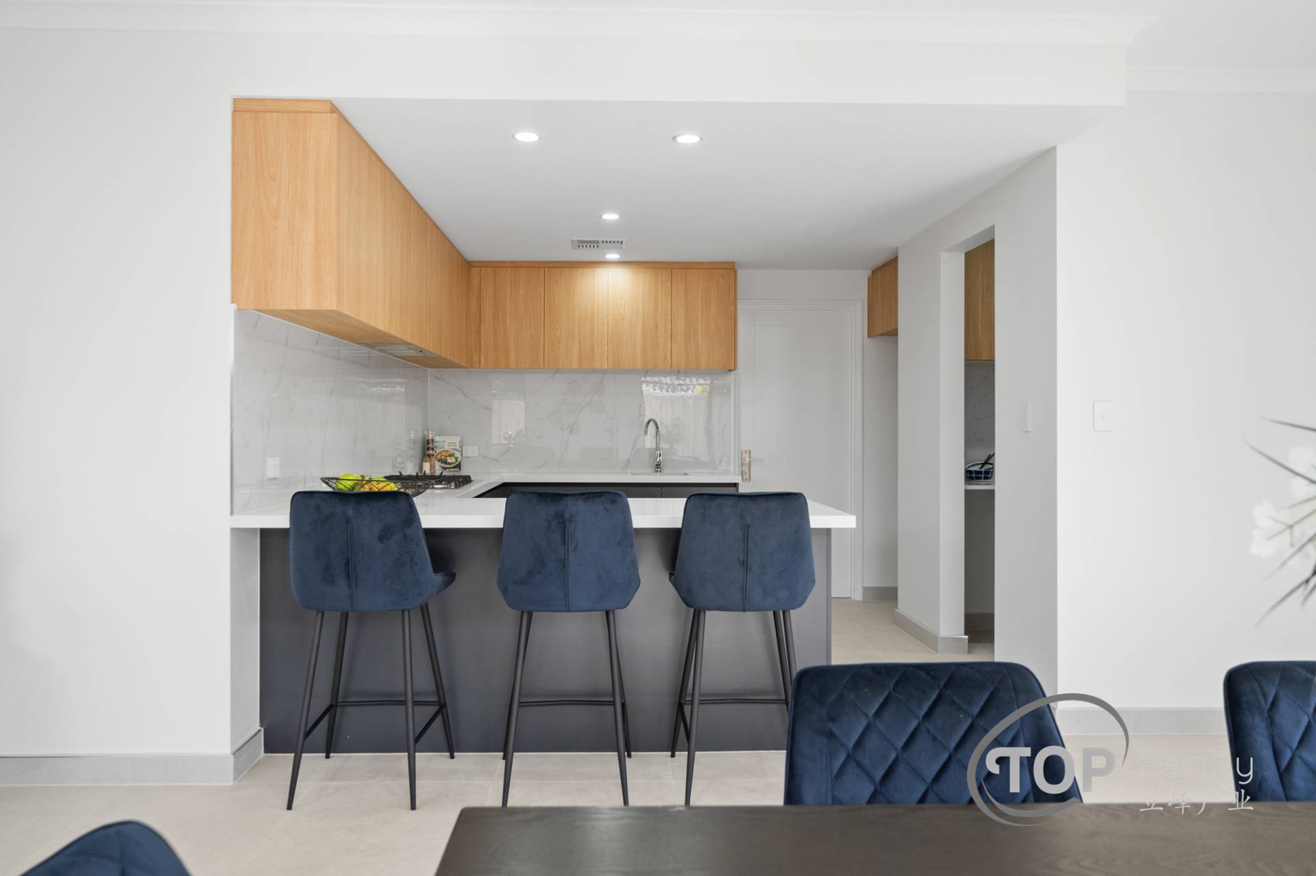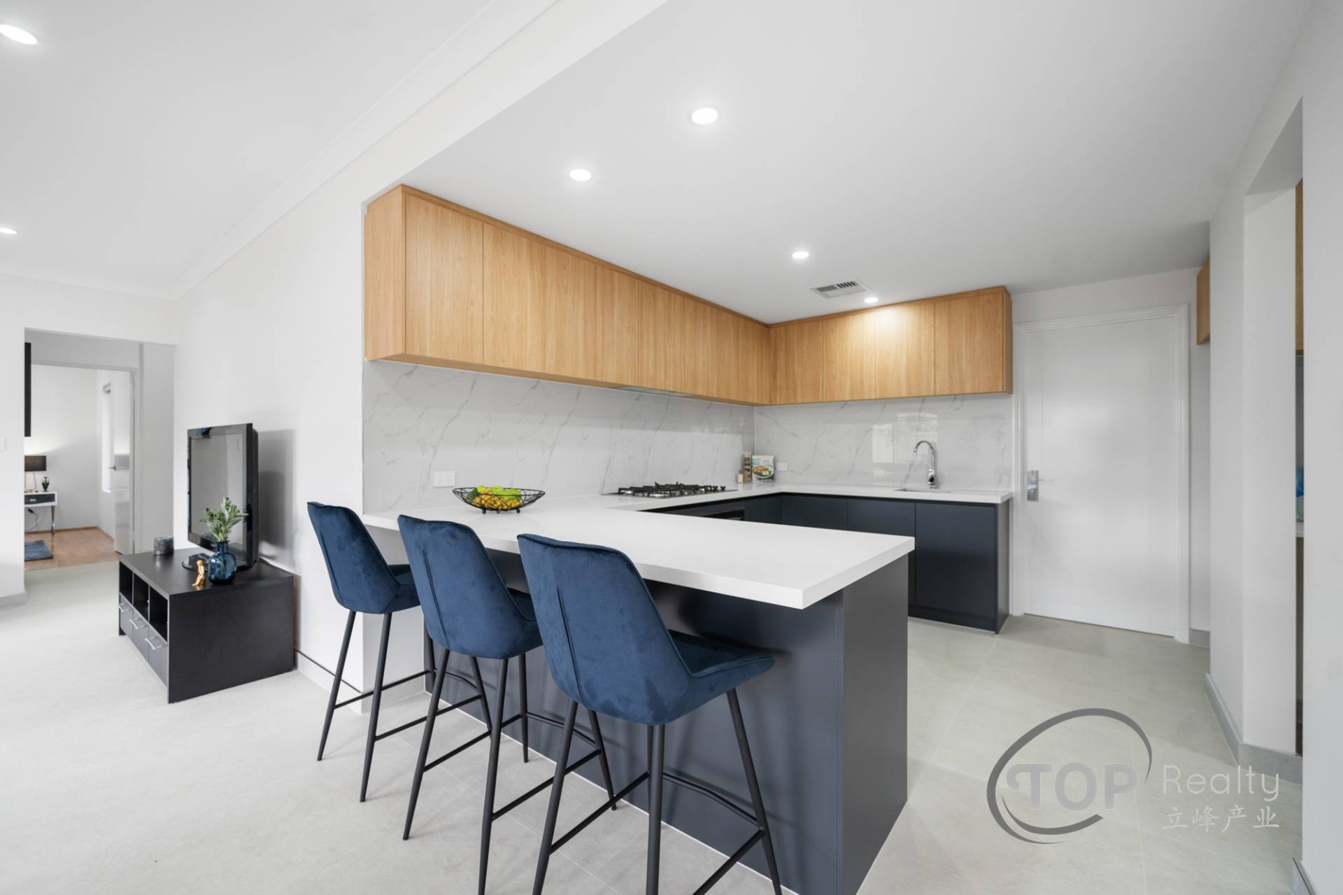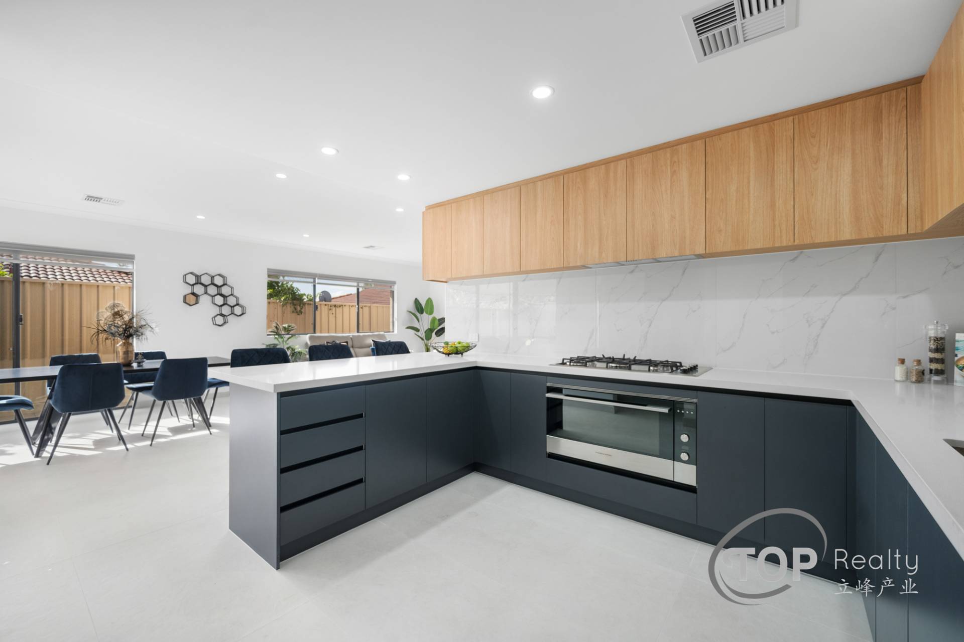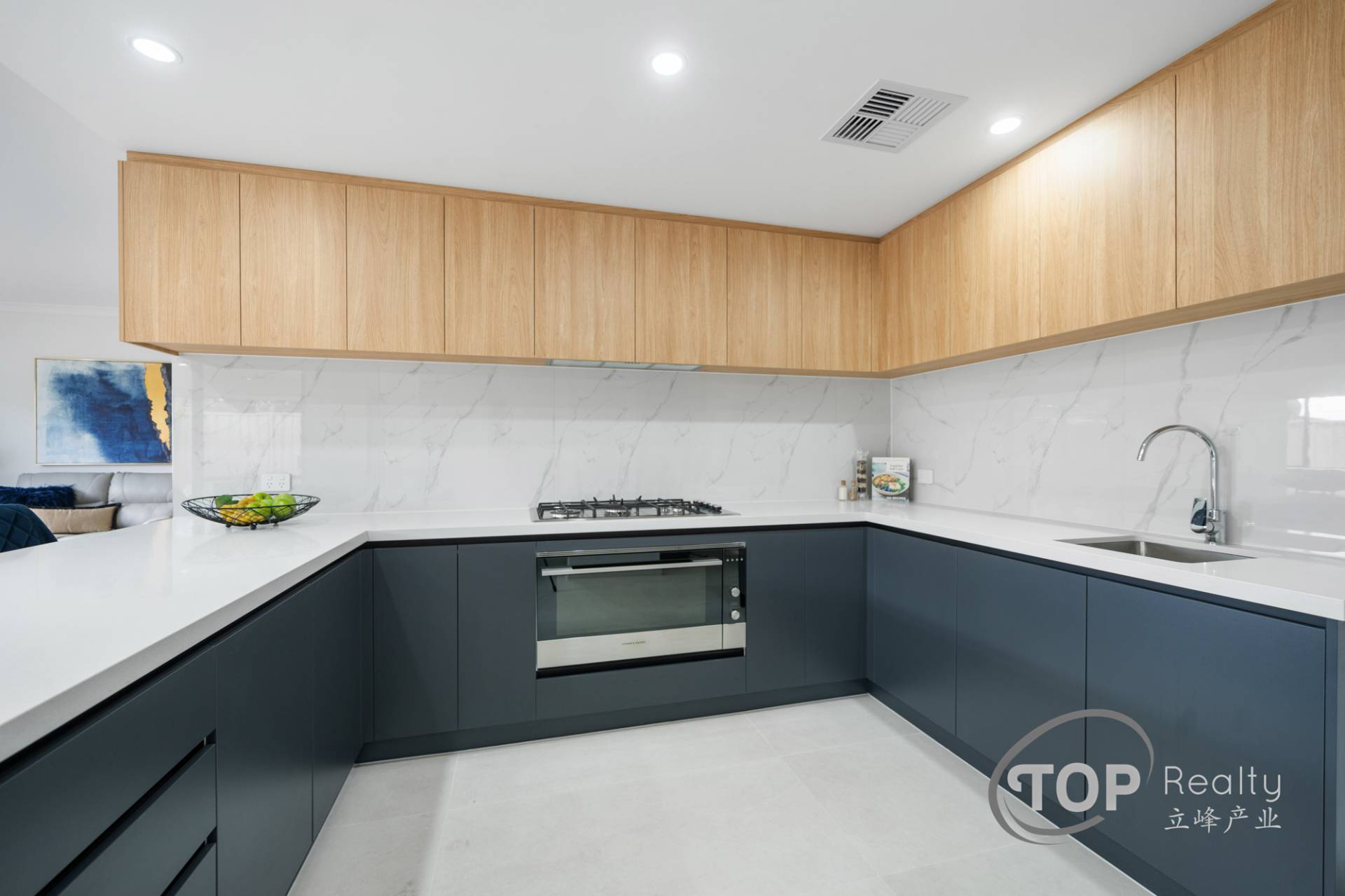 Premium kitchen with 40mm stone benchtops, 900mm Fisher and Paykel appliances, overhead cupboards with concealed under mount rangehood.