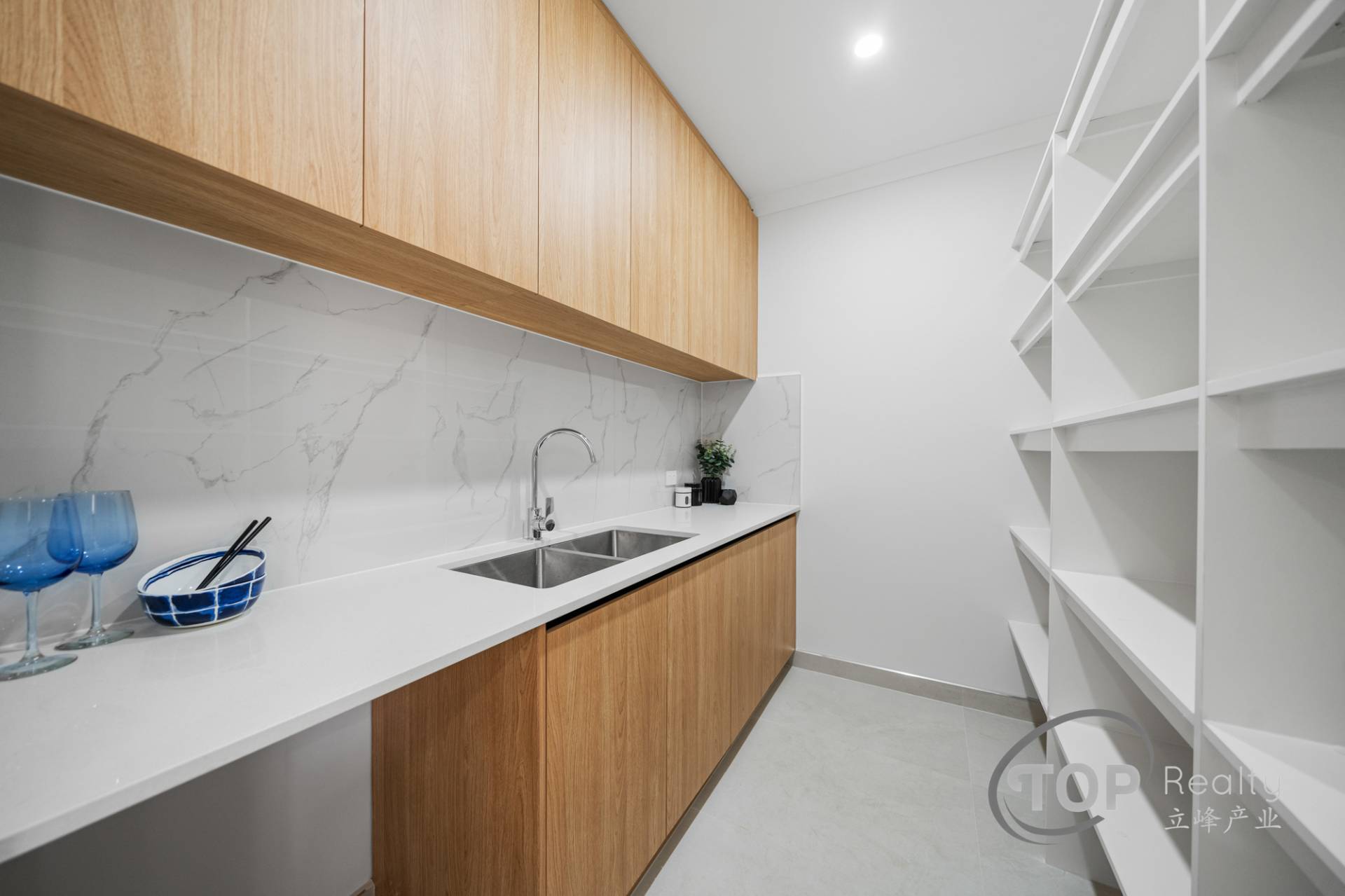 For passionate chefs, a separate scullery with prep area consisting of double bowl undermount sink/dishwasher recess and plenty of bench/shelf/storage space is on offer.