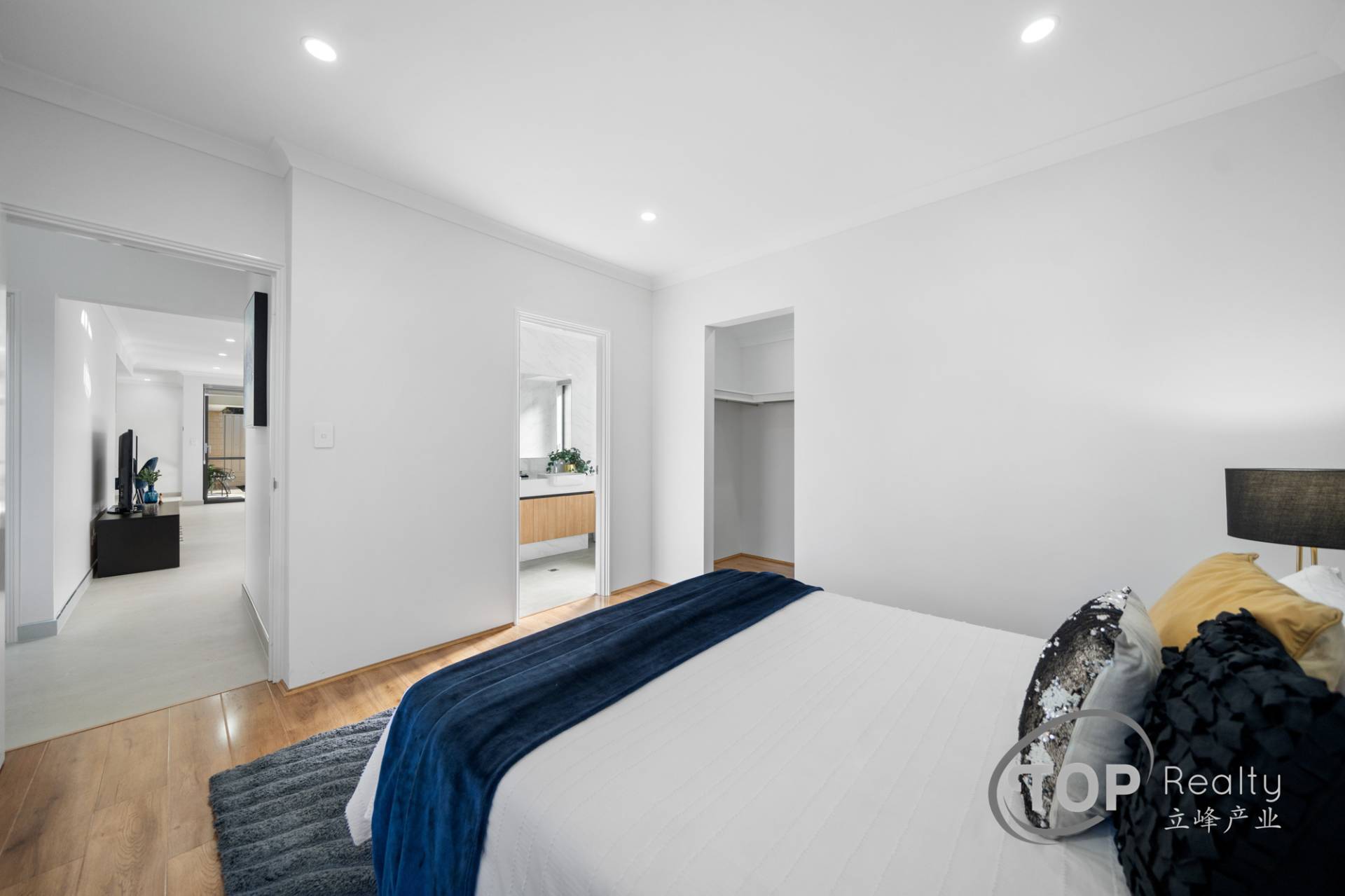 On your right is the spacious master bedroom with a large walk-in-robe, ensuite with floor to ceiling tiling through out and a luxurious freestanding bathtub.