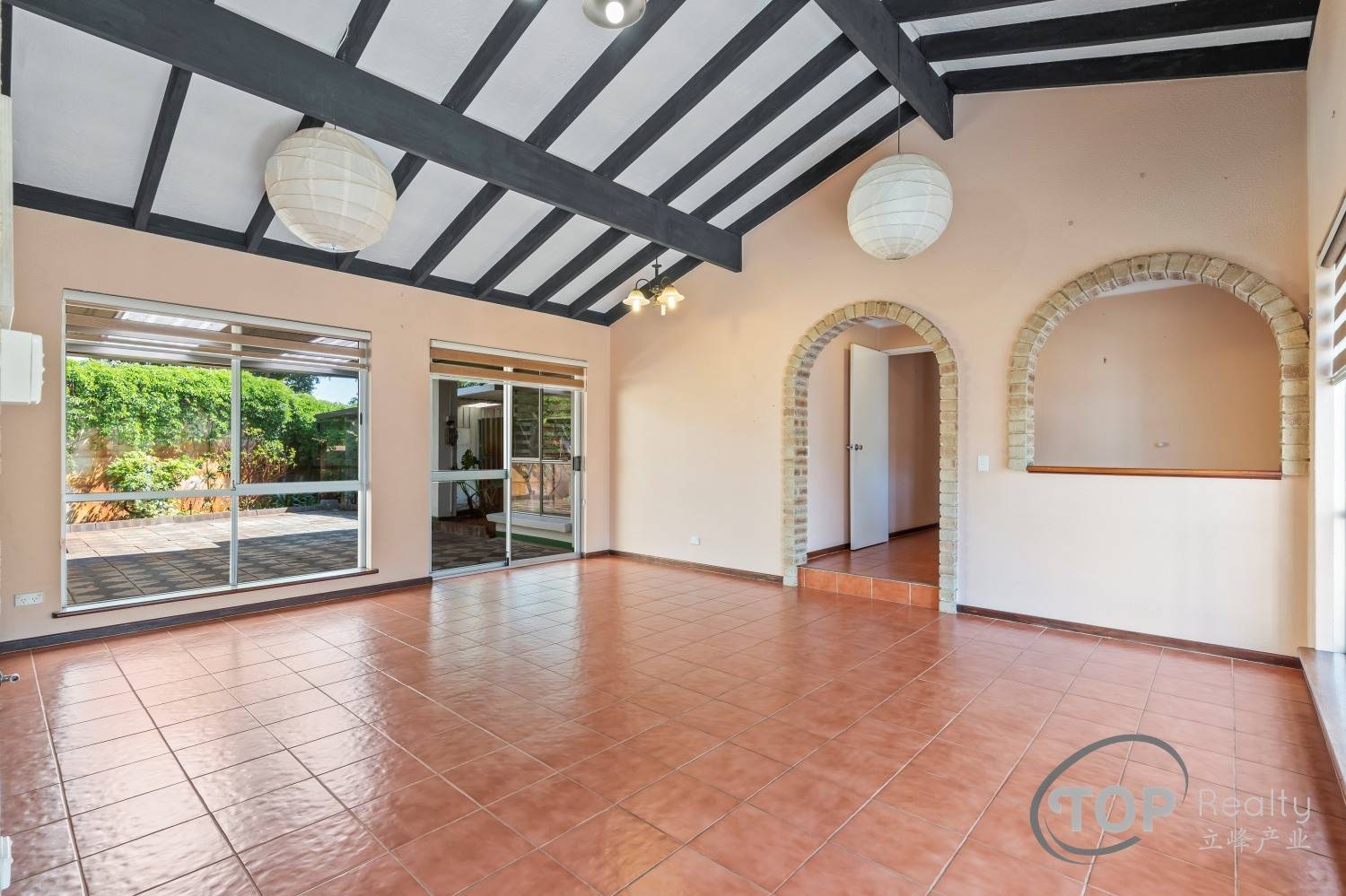 High raked ceiling to lounge & family room
