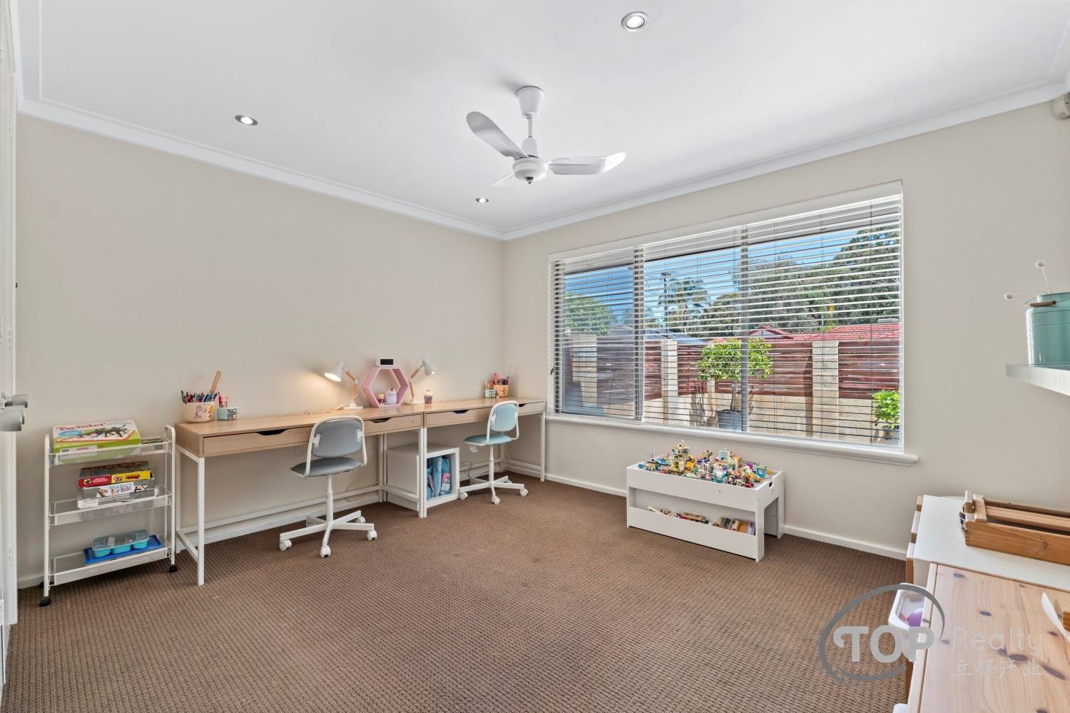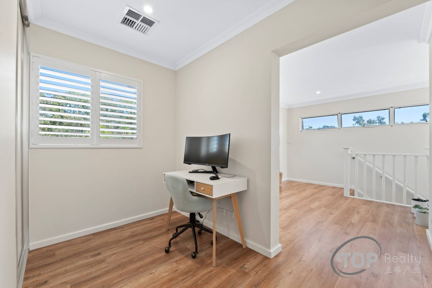 Upstairs, a private retreat awaits, complete with a study area and an additional minor bedroom with a built-in robe. The master suite is a true sanctuary, featuring a large walk-in robe and access to a luxurious semi-ensuite bathroom with a separate shower and bathtub. Plantation shutters on all first-floor windows add elegance and privacy.