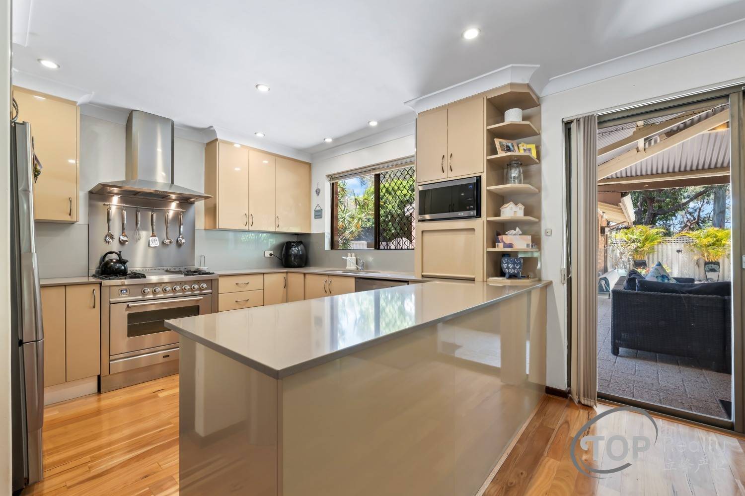 Stunning renovated kitchen features breakfast bar, gas cook top, dishwasher, range hood & stone bench top