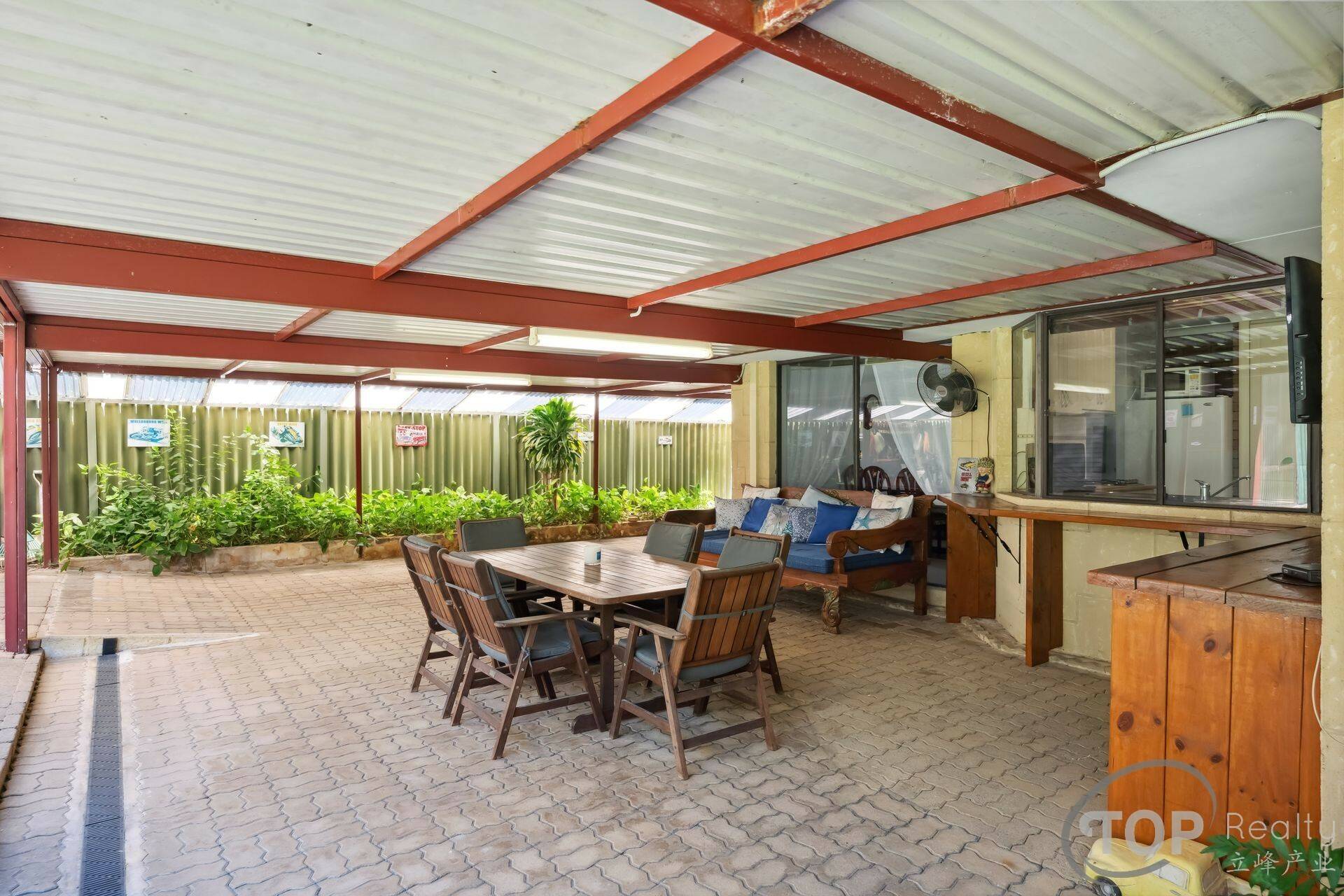 Large patio features wooden custom bench for outdoor living (bar fridge not included)