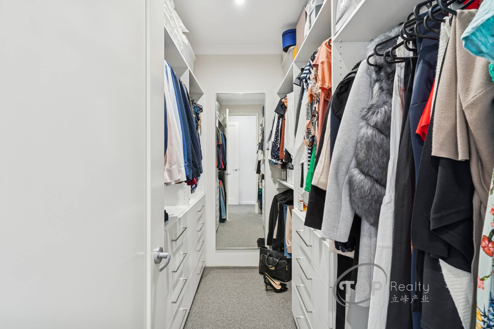 Large master bedroom features generous fitted walk-in wardrobe & ensuite with full height wall tiling & stone vanity top