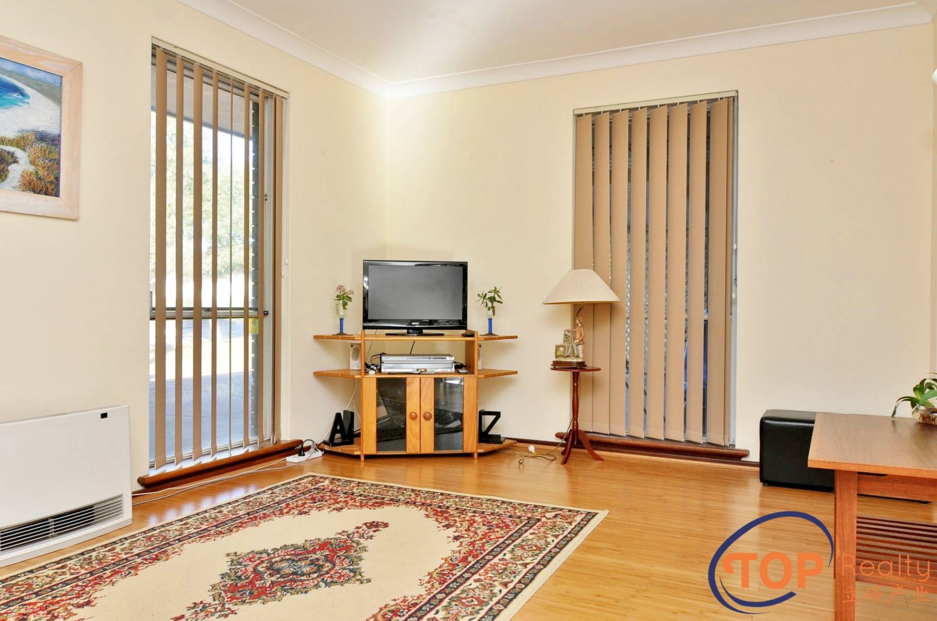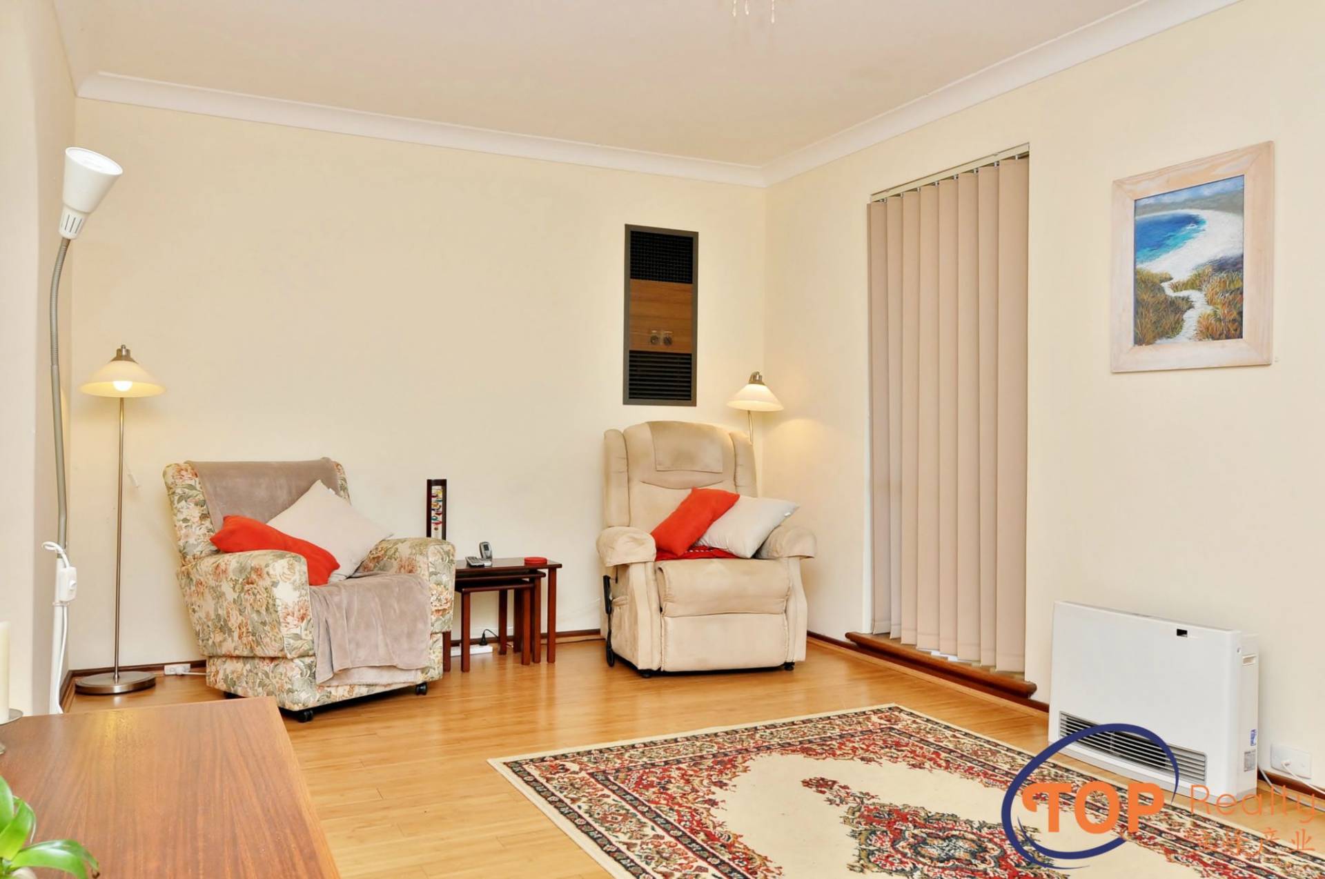 Lounge with wall air-con & floating floorboards