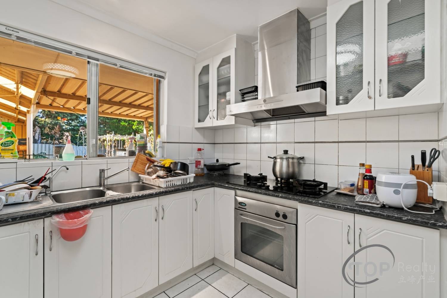 Kitchen features gas cook top, rangehood & generous cabinet storage space