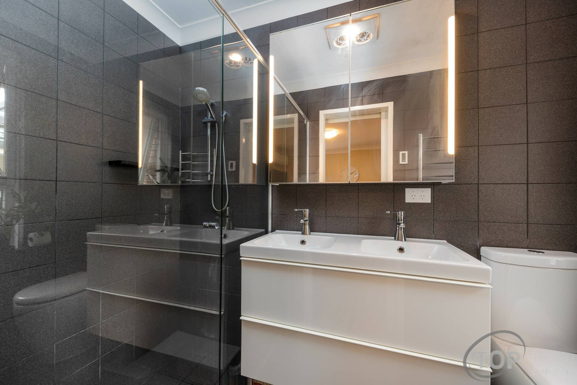 Large master bedroom with walk-in wardrobe & renovated ensuite featuring full height wall tiling, hobless shower & underfloor heating