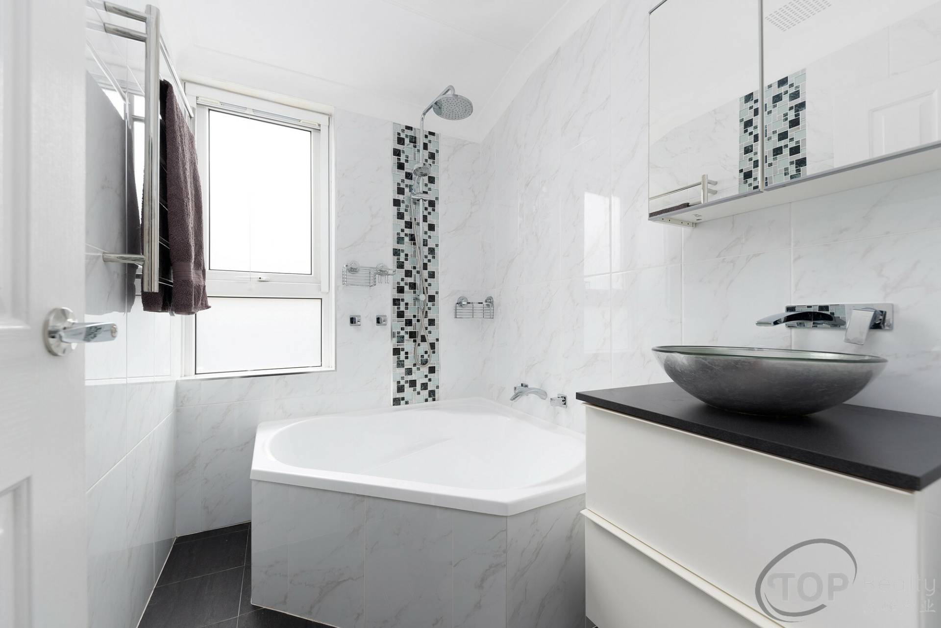 Renovated common bathroom features triangle bath, full height wall tiling & underfloor heating