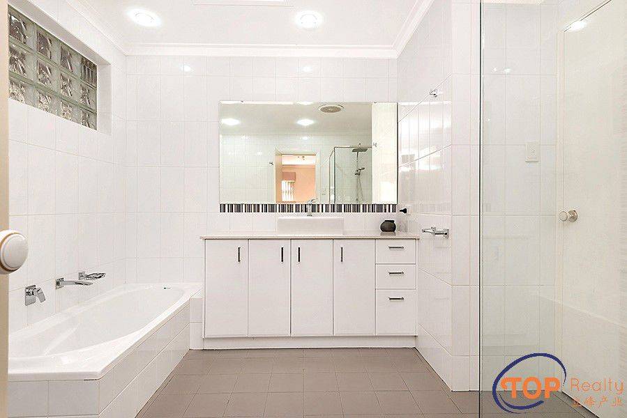 Large main bedroom with renovated semi-ensuite featuring stone vanity top, full height wall tiling, bath, shower & toilet