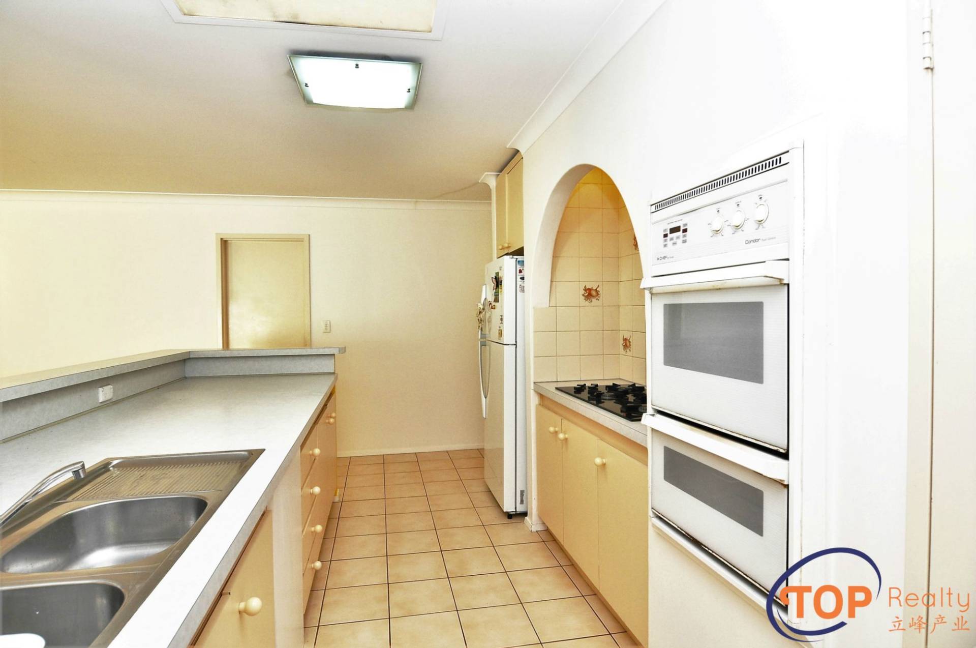 Large galley styled kitchen with gas cook top, plenty of bench top space & cabinet storage