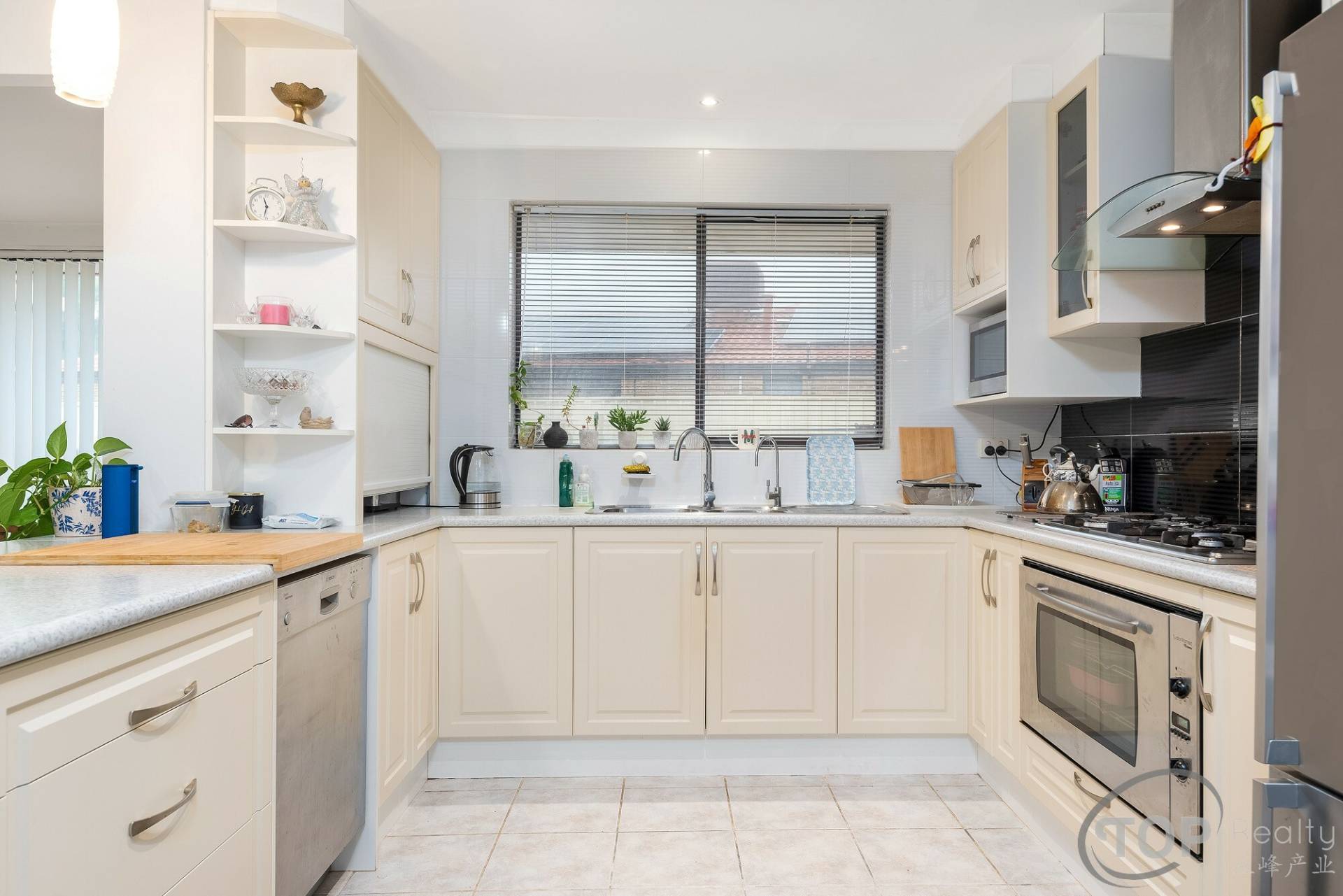 Large renovated kitchen well appointed with stainless steel appliances, abundant cabinet storage & bench top space & has aspect of backyard & pool